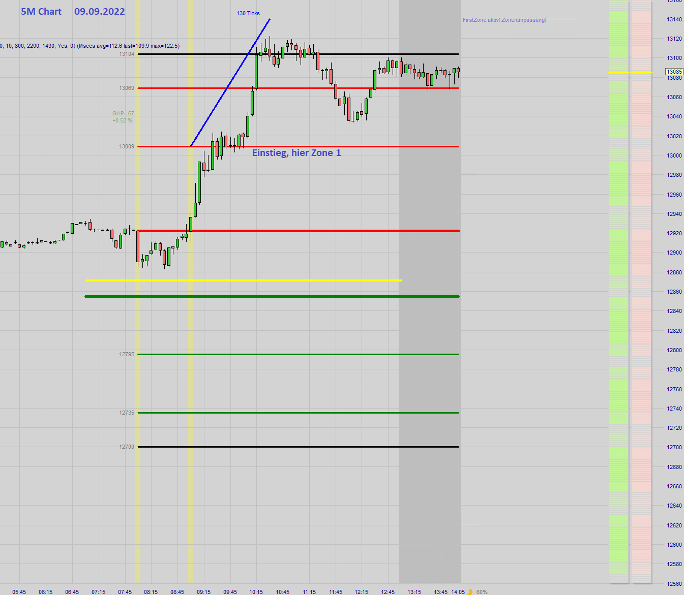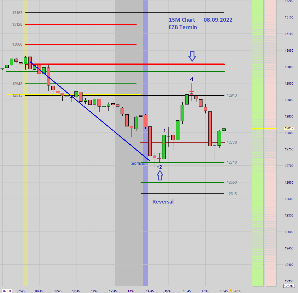 - Dax0909_15min: Das 15 Min Chart. Von 09:30 bis 09:45 hat die erste Umkehrkerze stattgefunden, die bei mir ca. 13007 geendet hat