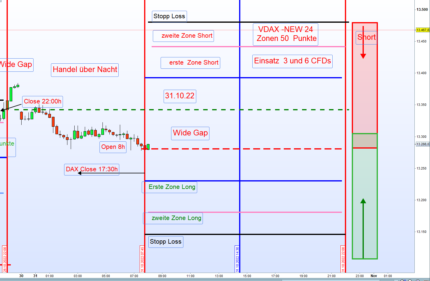 - Wurden vormittags bereits Gewinne erzielt bzw. eine Position aus der ersten Zone noch offen ist, dann erfolgt in der Zeit von 13:00h bis 14:45h keine weitere Positionseröffnung.