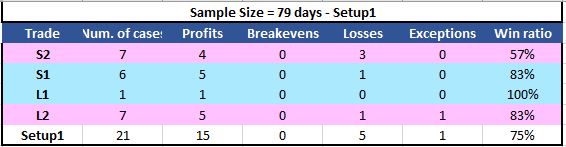 f) Exceptions: Hierbei handelt es sich um die Anzahl der Fälle, in denen der Kurs das Einstiegsniveau erreicht, sei es die GAPs oder L1, L2, S1 oder S2, es aber keine Umkehrkerze gibt oder die entsprechenden in der Strategie definierten Einstiegsbedingungen nicht erfüllt sind, z. B. bei den GAPs, wenn die Volatilität im VDAX-new 30 Punkte überschreitet.