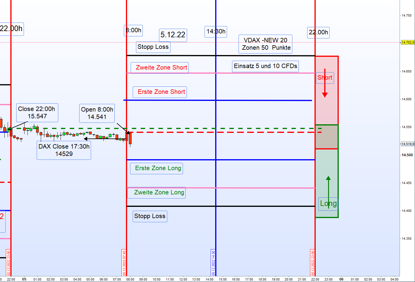 Trade Management: US Arbeitsmarktbericht Es werden bis 14:30h Long Positionen gehandelt. Der Einstieg unterliegt strengen Kriterien: Sofortiger Einstieg Long um 8:00h wenn DOW Futures und FDAX positiv notieren und auch steigender Kurs über dem Close vom DAX (XETRA) um 17:30h Vortag. Sind diese Voraussetzungen nicht gegeben, dann zuerst Eröffnung der Börse um 9:00h und Long Umkehrkerze abwarten. Dieser Einstieg ist dann die erste Zone Long. Teilgewinne (TP) zum Beispiel mit 30-50 Punkten, je nach Volatilität, können auch realisiert werden. Bei Rücksetzer kann Aufstockung erfolgen. An zweiter Zone Long Verdopplung der Position. Kein Handel dieses Setups wenn der VDAX-NEW über 30 notiert und wenn ein Doppel Gap oder Wide Gap in Shortrichtung vorliegt.