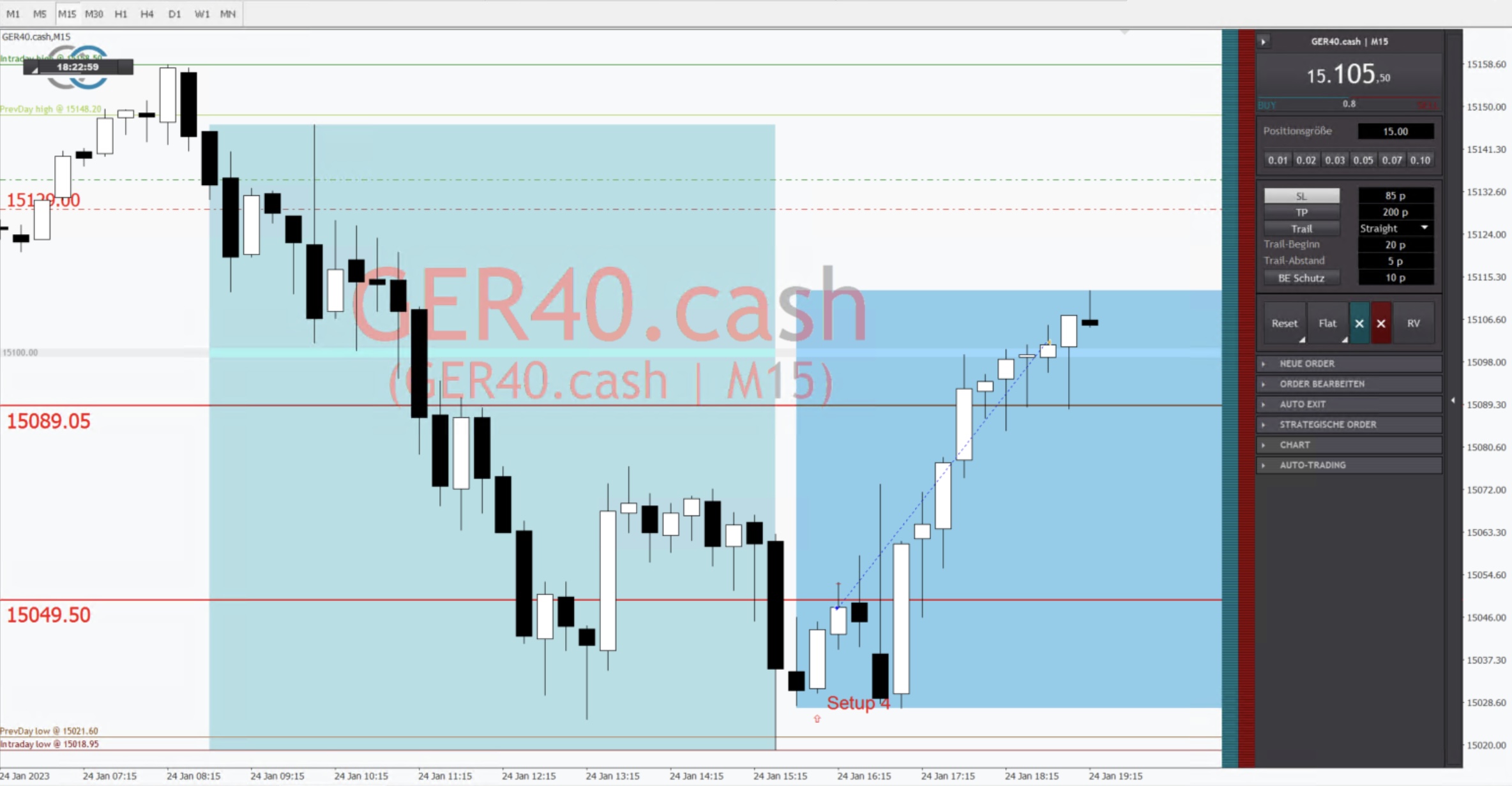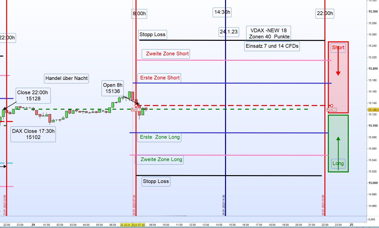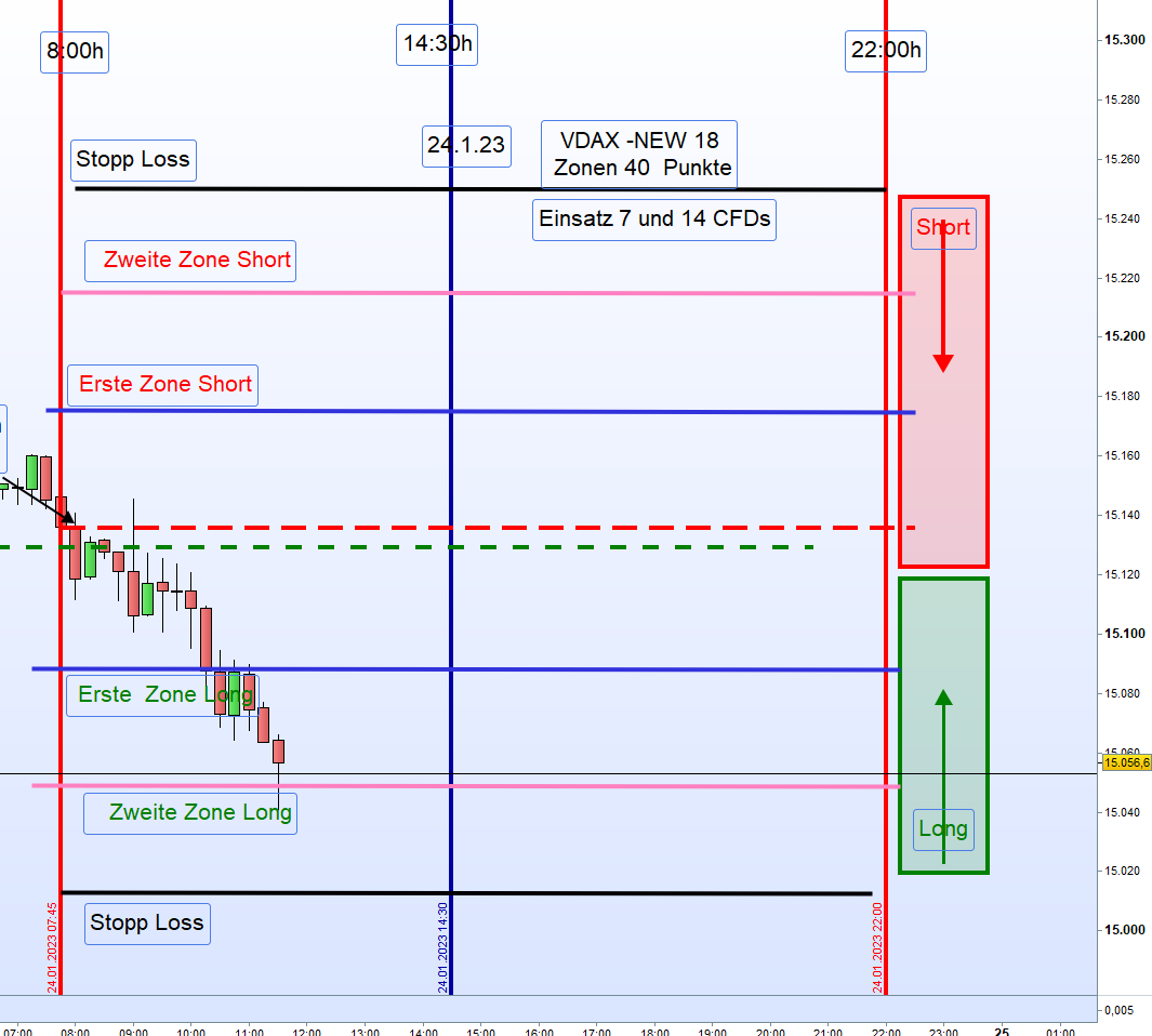 Der Handel beginnt erst ab 9:00h (Eröffnung XETRA DAX.) Der Einstieg muss charttechnisch korrekt sein und durch eine 15M Candlestick-Kerze bestätigt werden. Notiert bis 9.00h der Kurs bereits über 30 Punkte in Richtung Gap-Schließung, dann erfolgt ein Handel der normalen Zonen. Besteht eine allgemeine Unsicherheit, kein Handel am Vormittag.
