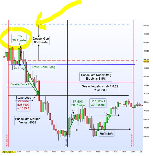 Versteh ich nicht. Nach 50% Gewinn und anschließendem Refill liefen 100% und die Verdopplung an Zone 2 in den SL. Oder nicht?Noch eine Anmerkung, speziell zu diesem Tag, die aber auch allgemein gilt.Laut Regelwerk liegt (für BUY) der SL 35 P. unter Zone 2. Einstieg erfolgt aber (Alarm etc.) 10 P. ÜBER der Zone. Daraus folgt messerscharf bei Verlust eine Anzahl von 45 Punkten.Dies gilt auch für die Verluste, welche aus Zone 1 erwirtschaftet werden, falls nicht der Einstieg (wie am 19.1.23) ohne das Alarm-System erfolgt.Das ganze ohne slippage, die häufig auftaucht, gerade dann, wenn es dynamisch in denn SL geht.