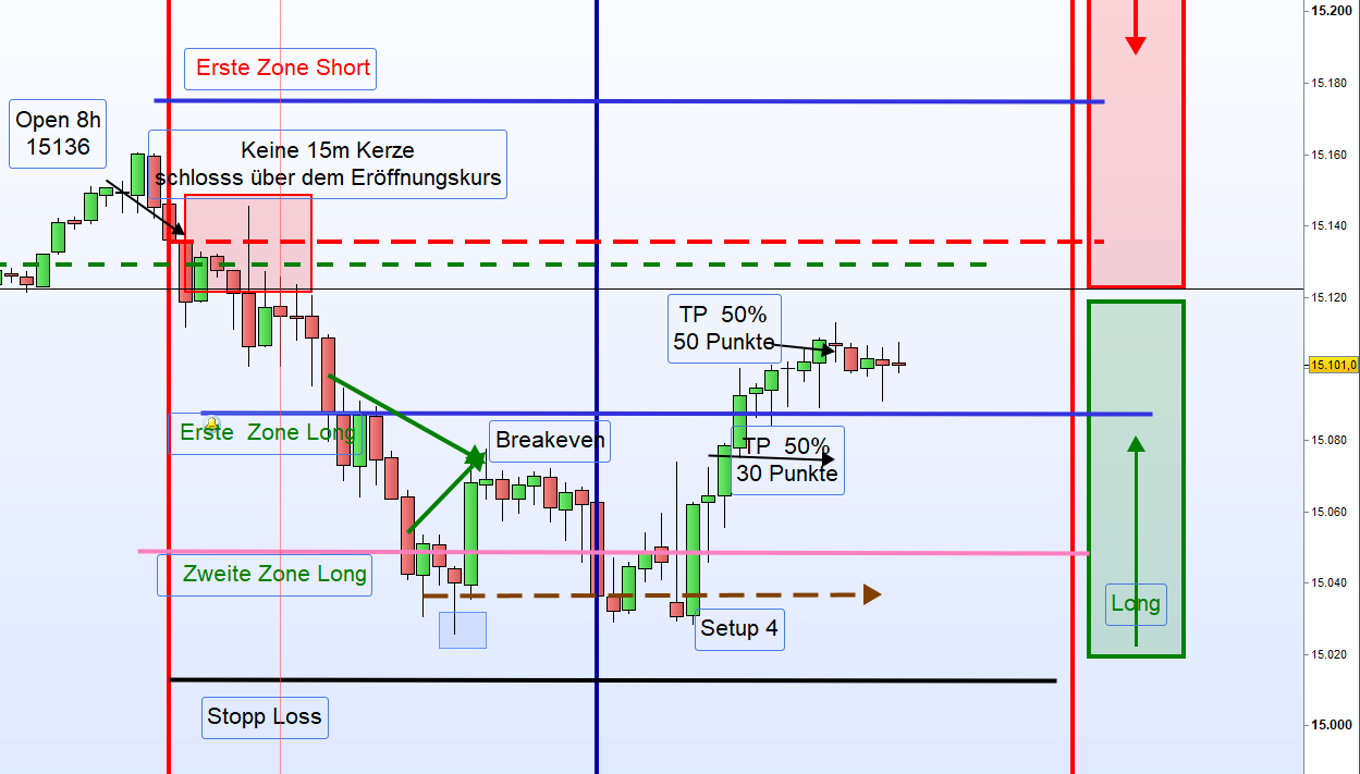 Mit der Glattstellung Breakeven konnte dann ohne Risiko der Setup 4 gehandelt werden.