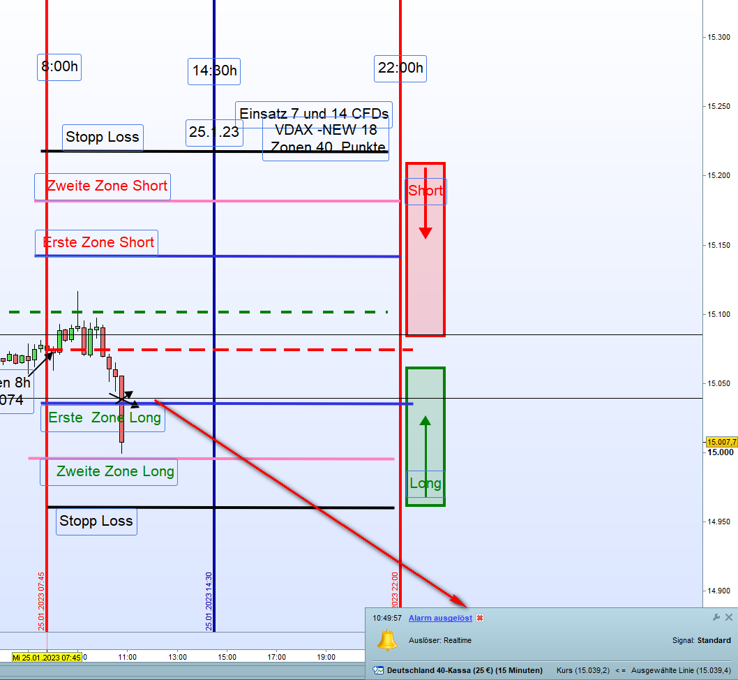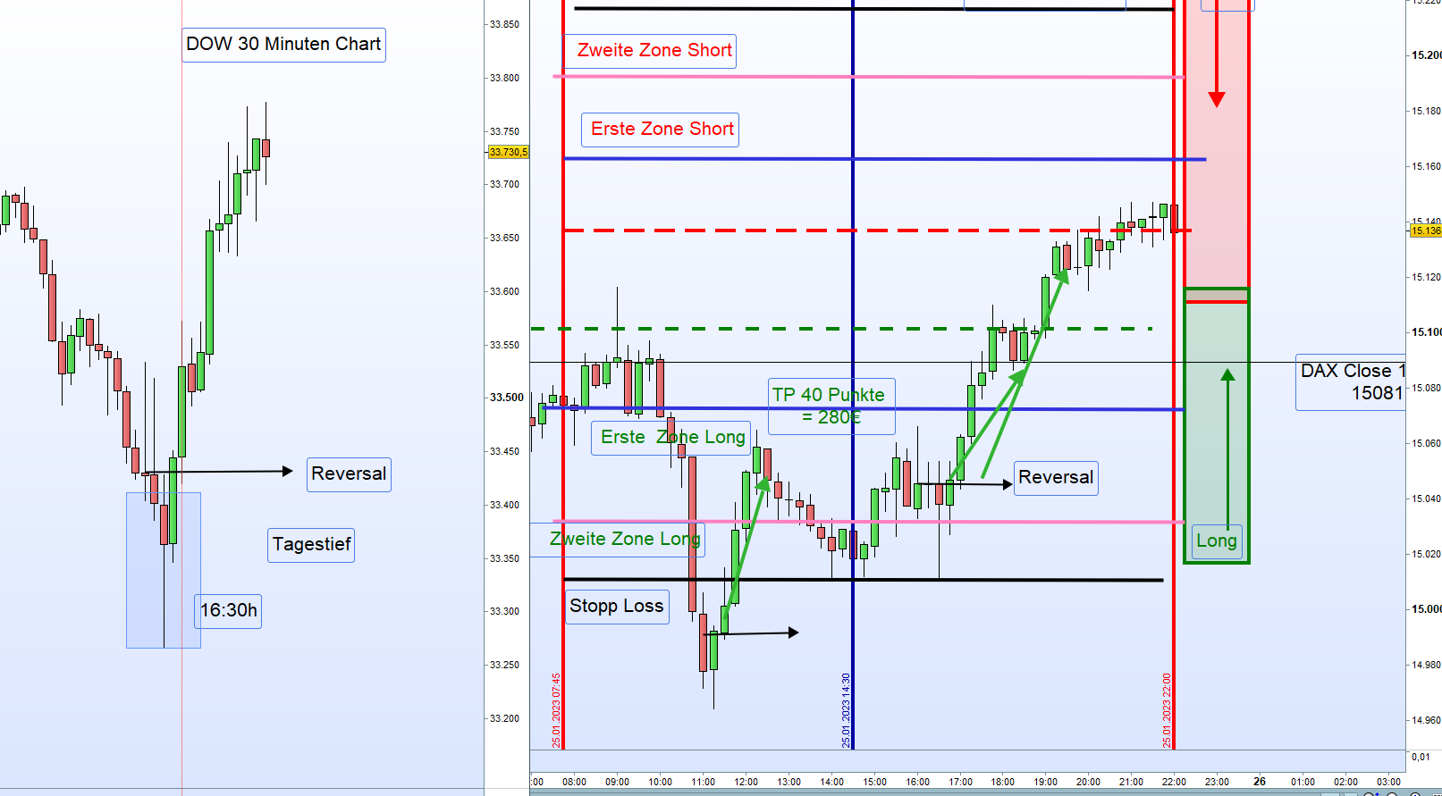 Warum ohne Risiko? Erstens weil sich die DJIA FUT in die Richtung Long bewegte und immer noch die zweite Zone am Nachmittag zur Verfügung stand. -