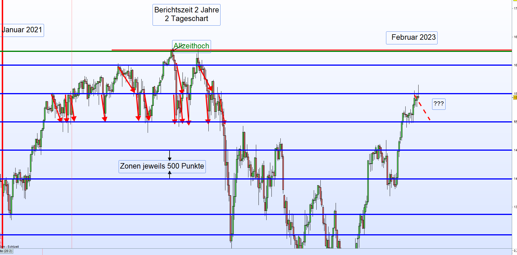Georg, wo genau sollte denn der erste Einstieg sein, ca: 586? Dann wäre Zone 3 bei ca 626, SELL mitels Alarm-Systematik bei ca 616. Eingezeichnete Zone nebst entry scheint einiges zu hoch zu liegen, dementsprechender Gewinn (in der Grafik) fällt bei meinen Zahlen weg. Schau das doch nochmal an!