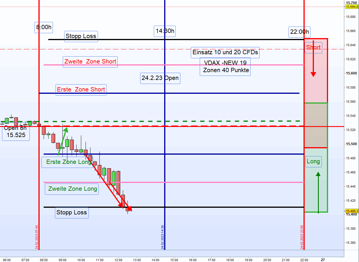 - Wurden an der ersten und zweiten Zone, Short oder Long, Positionen eröffnet und nur die Positionen aus der zweiten Zone mit Gewinn glattgestellt, dann wird nach einem Retracement (Rückkehrbewegung) bis zur zweiten Zone dort nur dann eine neue Position eröffnet, wenn der VDAX-NEW unter 20 notiert"