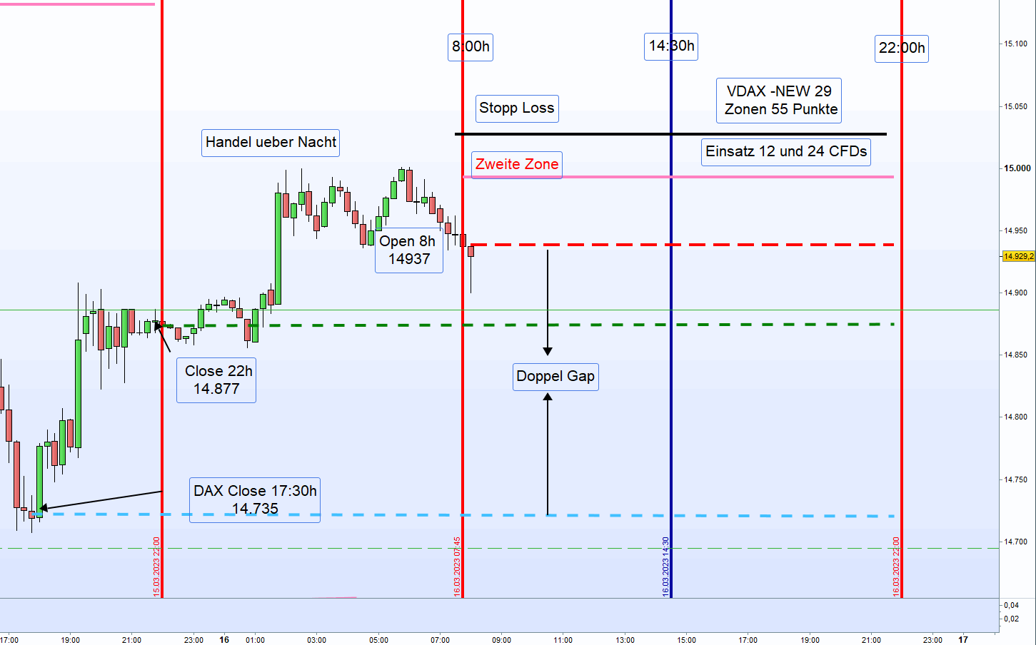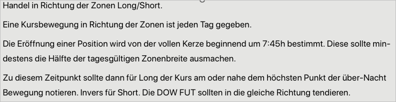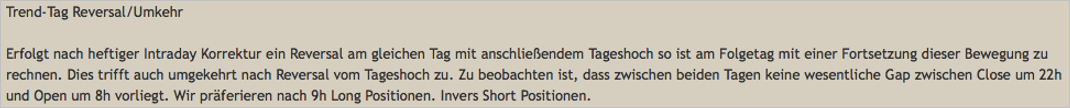 Dies trifft auch umgekehrt nach Reversal vom Tageshoch zu. Zu beobachten ist, dass zwischen beiden Tagen keine wesentliche Gap zwischen Close um 22h und Open um 8h vorliegt. Wir präferieren nach 9h Long Positionen. Invers Short Positionen. " -