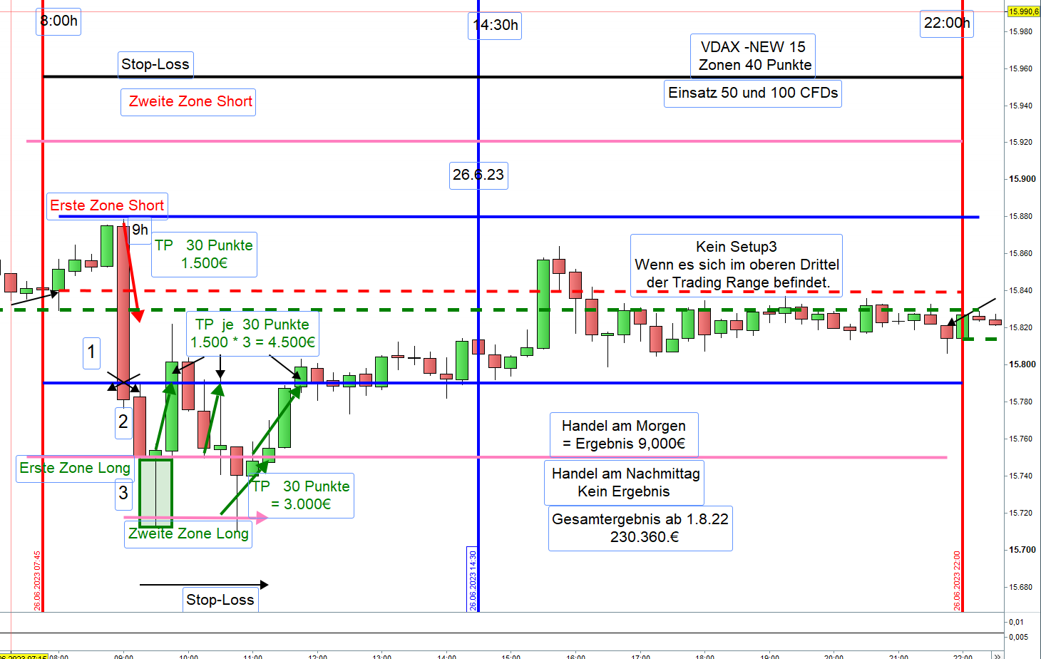 Handel am Nachmittag: Voraussetzungen für den Handel am Nachmittag sind folgende Intraday Handelsspannen: Ab 100 Punkte für VDAX-Notierung bis 20. Ab 125 Punkte für VDAX-Notierung zwischen 20 und 30. Ausgenommen Setup 3. Offene Positionen vom Vormittag, insbesondere aus den zweiten Zonen, sollten a priori abgewickelt werden. Sofern morgens beide Positionen aus der ersten und zweiten Zone mit hohem Verlust ausgestoppt wurden, so wird auf dieser Seite des Charts nachmittags nur dann gehandelt, wenn nach dem Ausstoppen der Kurs wieder in die zweite Zone gehandelt wurde (Seiten 51, 54).