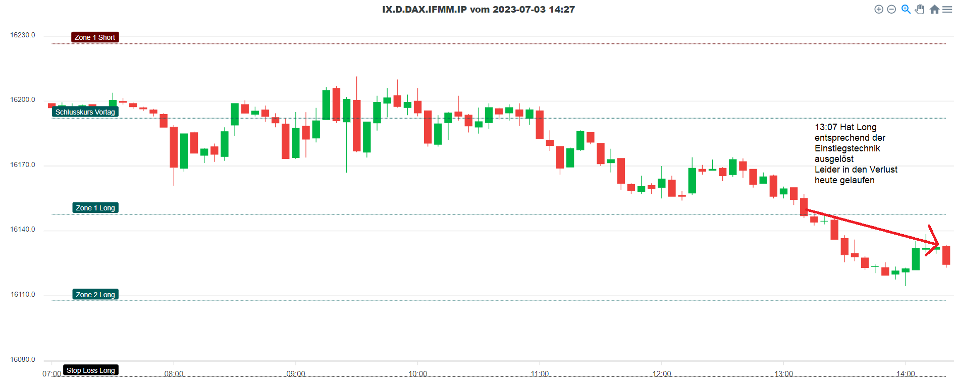 Heute Vormittag zuerst kein Trade. Kurz nach 13:00 kam der Kurs dann bei Zone1Long vorbei und ist in den Verlust gelaufen.