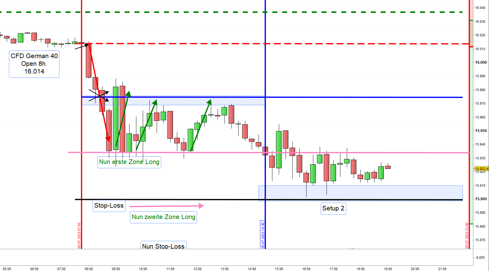 Wer an der ersten Zone Long eingestiegen ist, hätte mit dieser Position um 14:30h mit Time Stopp eine Verlust gemacht. Mit dem Einstieg an der zweiten Zone Long jedoch insgesamt ein Gewinn weil mit doppeltem Einsatz.