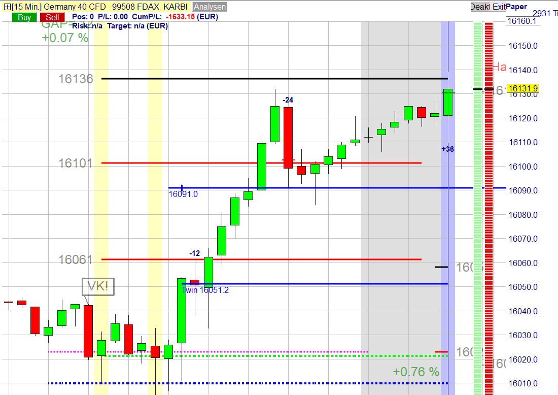 Am Nachmittag erfolgte der Einstieg Short an der Stop- Loss Linie mit Setup 2 Short bei 16.137. Diese Position lief bis zur zweiten Zone in den Verlust. Der dort dann erfolgte Einstieg Short mit doppeltem Einsatz hat sein TP mit 30 Punkten erfüllt. Die dann noch offene Position aus der ersten Zone wurde auch mit dem GS Stopp mit kleinem Verlust geschlossen.