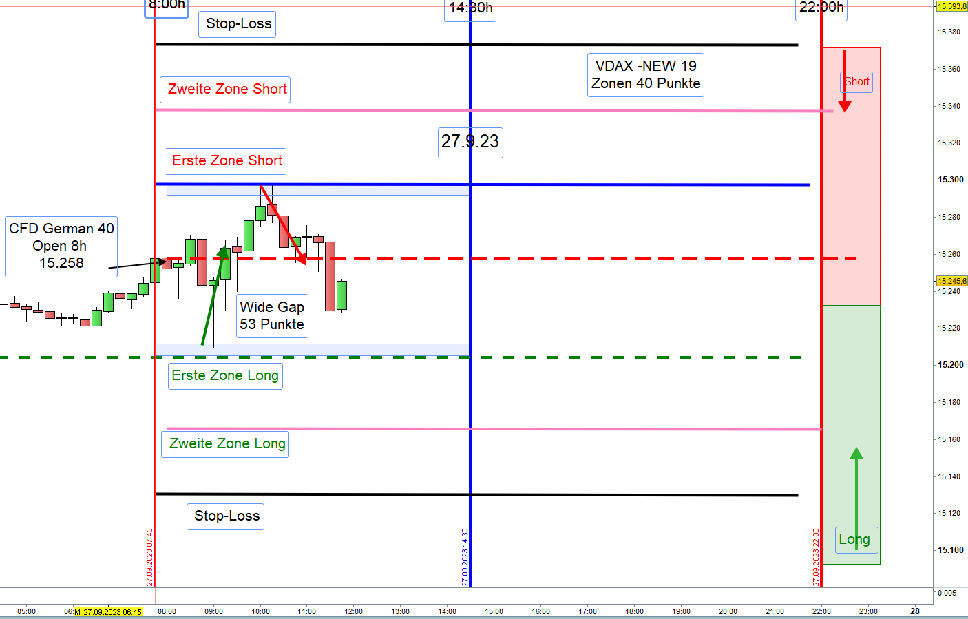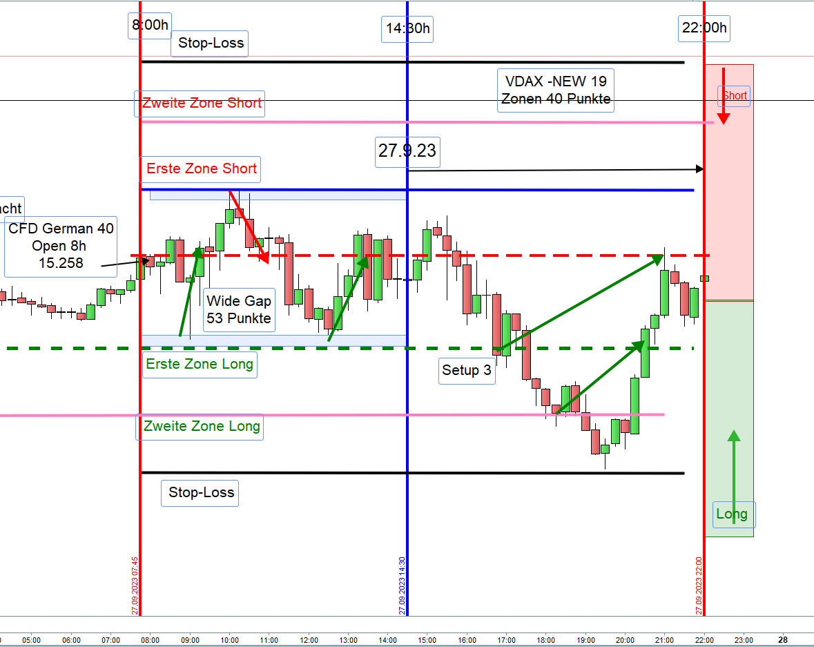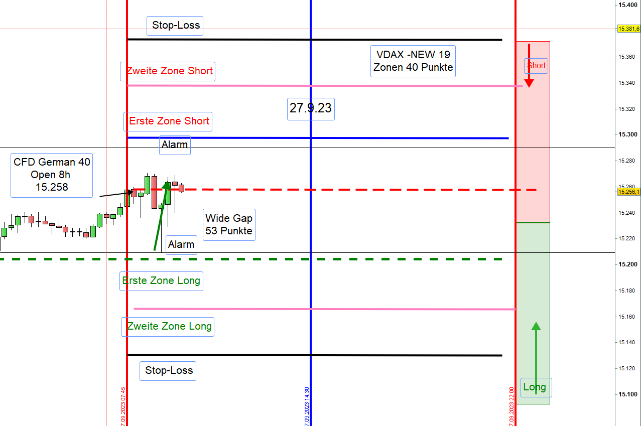 Hat morgens die Trading Range keine 100 Punkte, bei VDAX-NEW unter 20, erreicht, so wird so lange nachmittags nicht gehandelt bis die 100 Punkte erreicht wurden. Werden die 100 Punkte nachmittags erreicht, dann ist dort nach Einstieg die erste Zone.