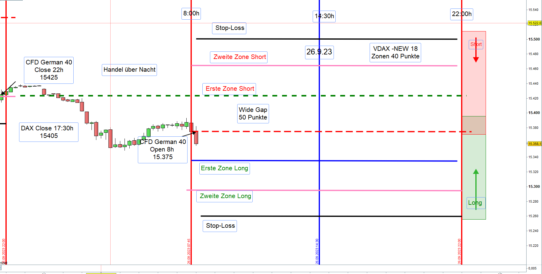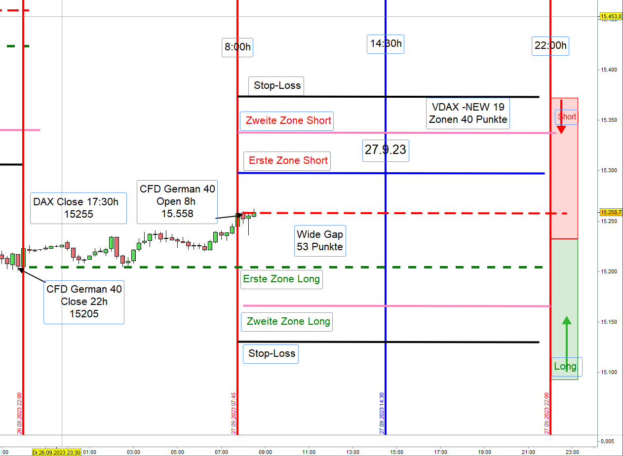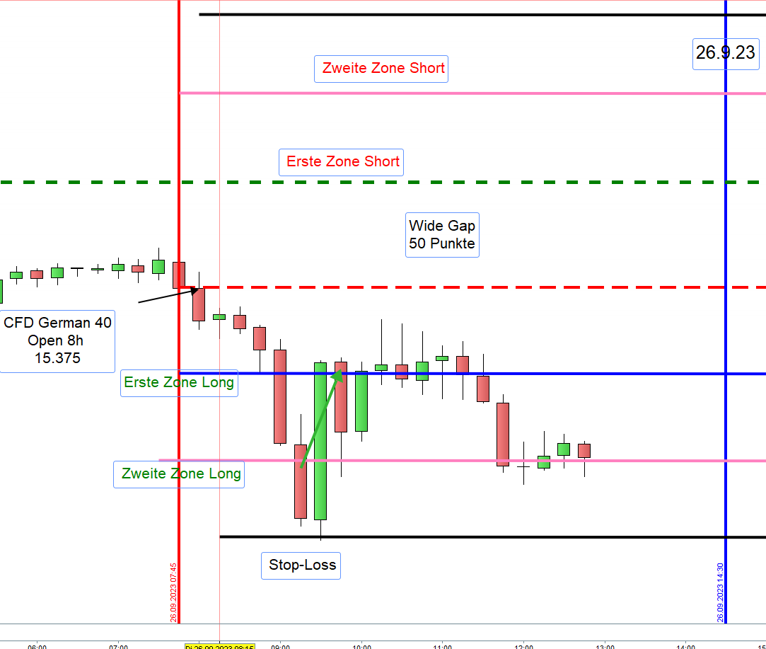 Hat morgens die Trading Range keine 100 Punkte, bei VDAX-NEW unter 20, erreicht, so wird so lange nachmittags nicht gehandelt bis die 100 Punkte erreicht wurden. Werden die 100 Punkte nachmittags erreicht, dann ist dort nach Einstieg die erste Zone.