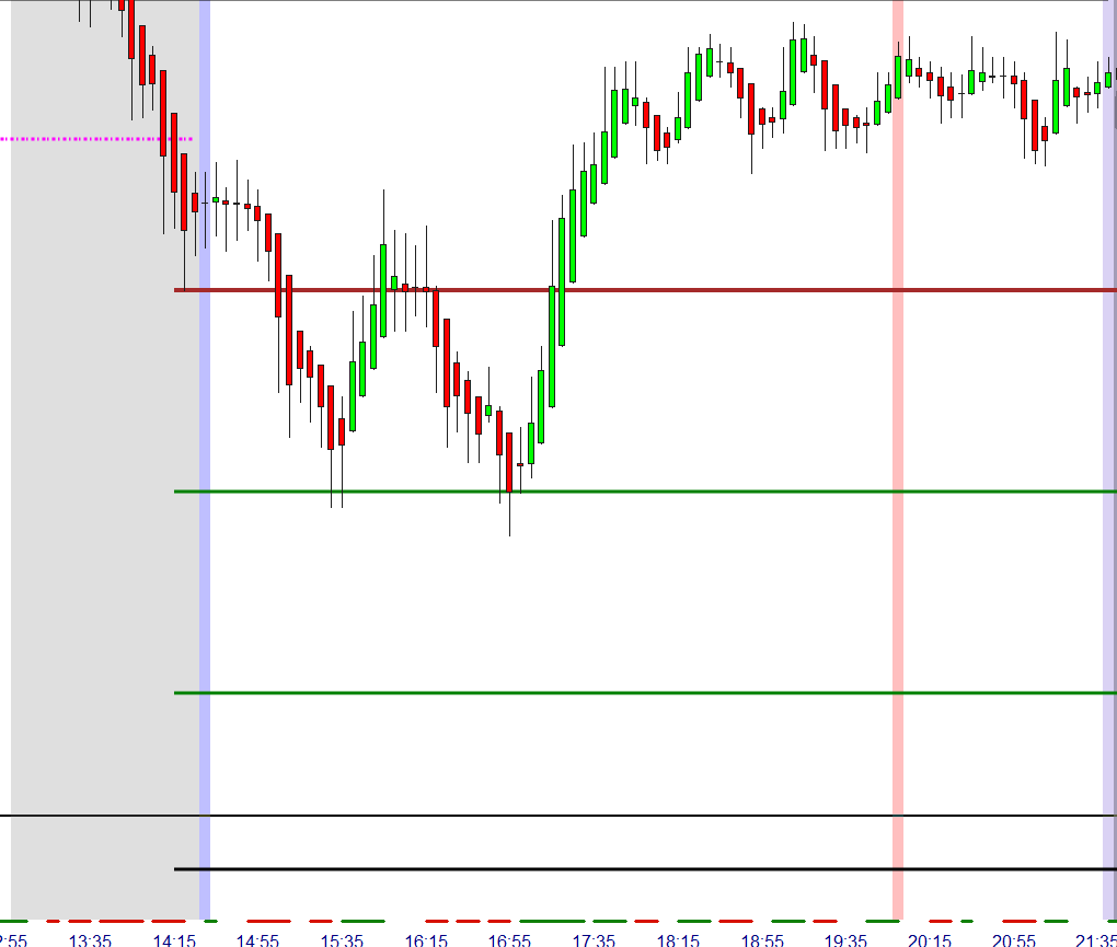 Sofern morgens den Stop-Loss erreicht wurde, so wird auf dieser Seite des Charts nachmittags nur dann gehandelt, wenn der Kurs wieder in die zweite Zone gehandelt wurde. Der Grund für diese Sicherheitsmaßnahme ist, dass der Kurs sehr oft die initiale Richtung fortsetzt und dann ein Trend-Tag vorliegen kann. Ausgenommen Early und Late Reversals, Setup 5.