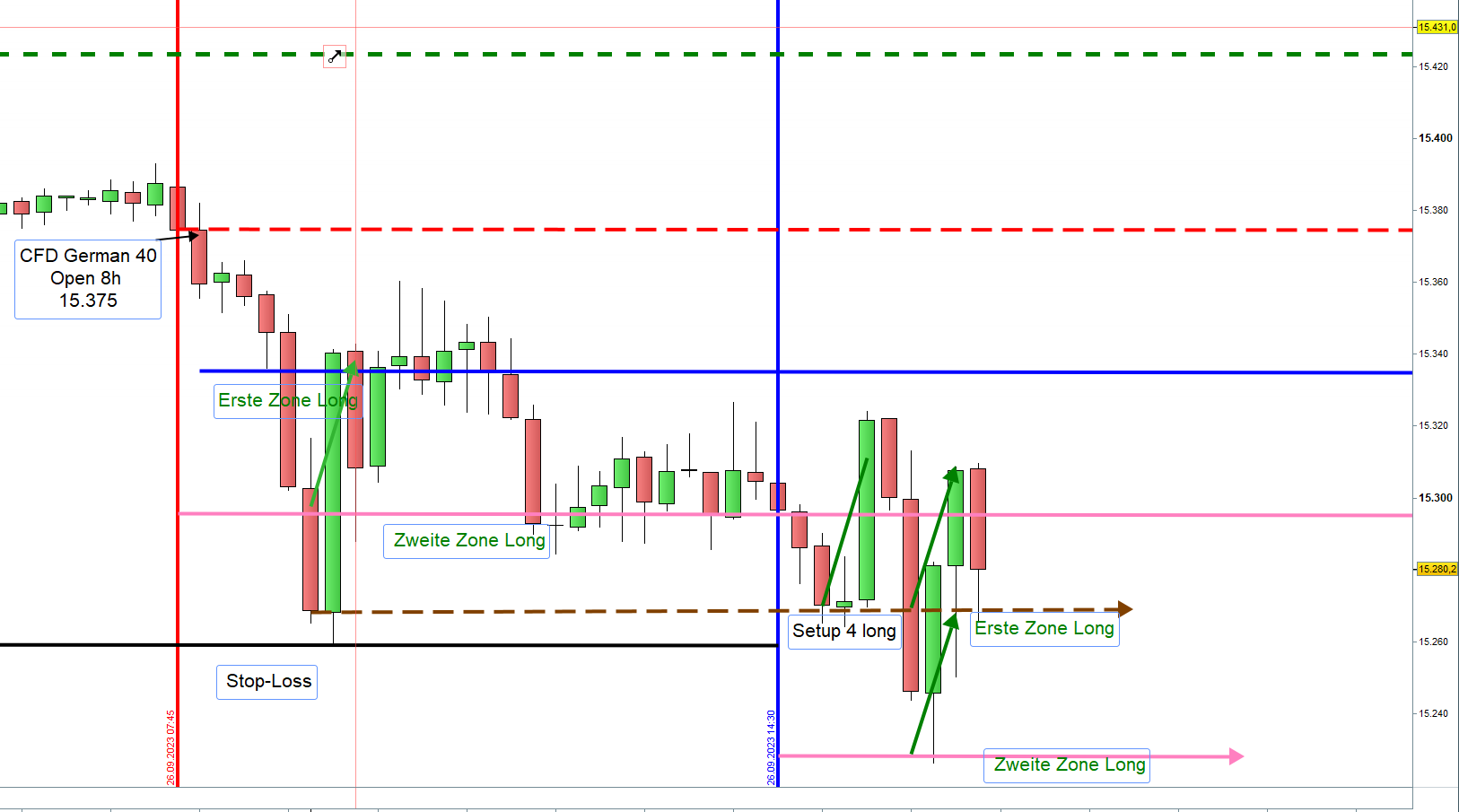 Für den Setup 4 gelten die abgeschlossen 15M Candlesticks als Einstieg.