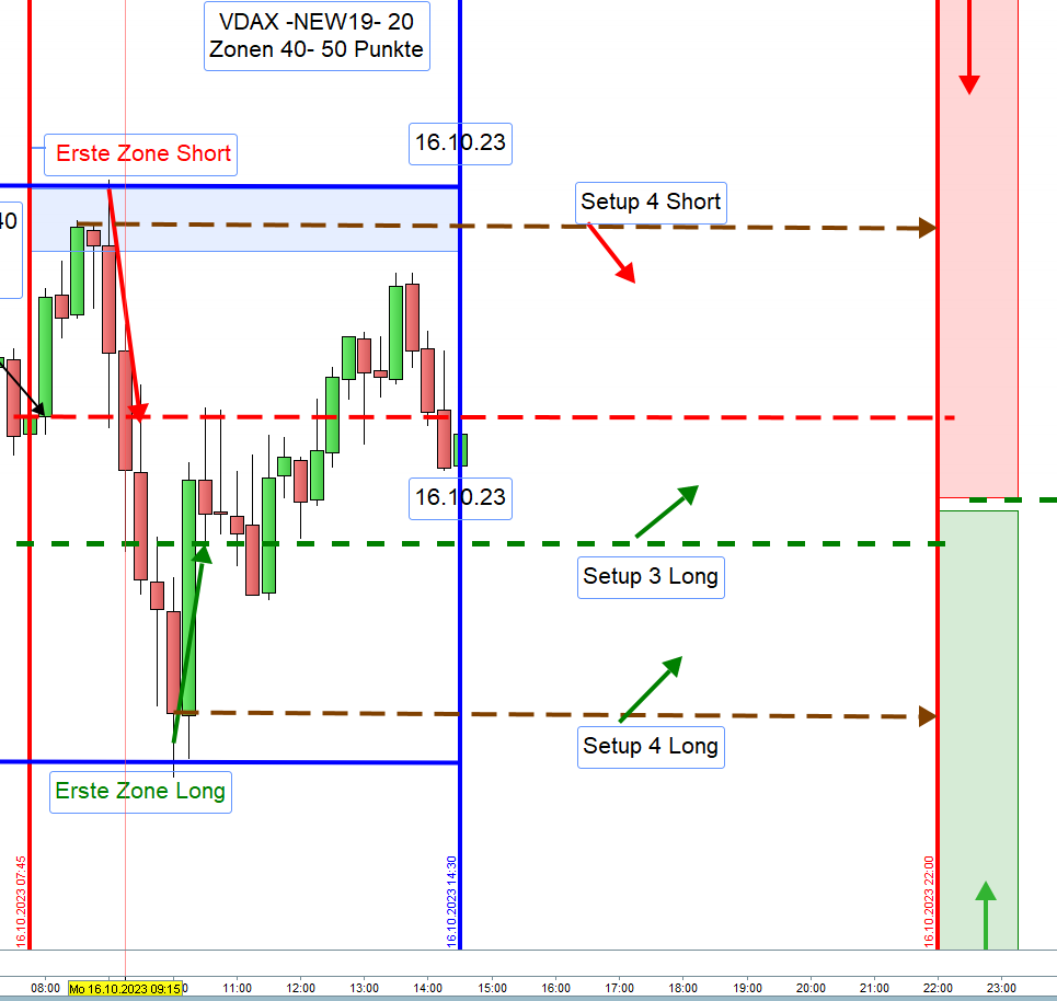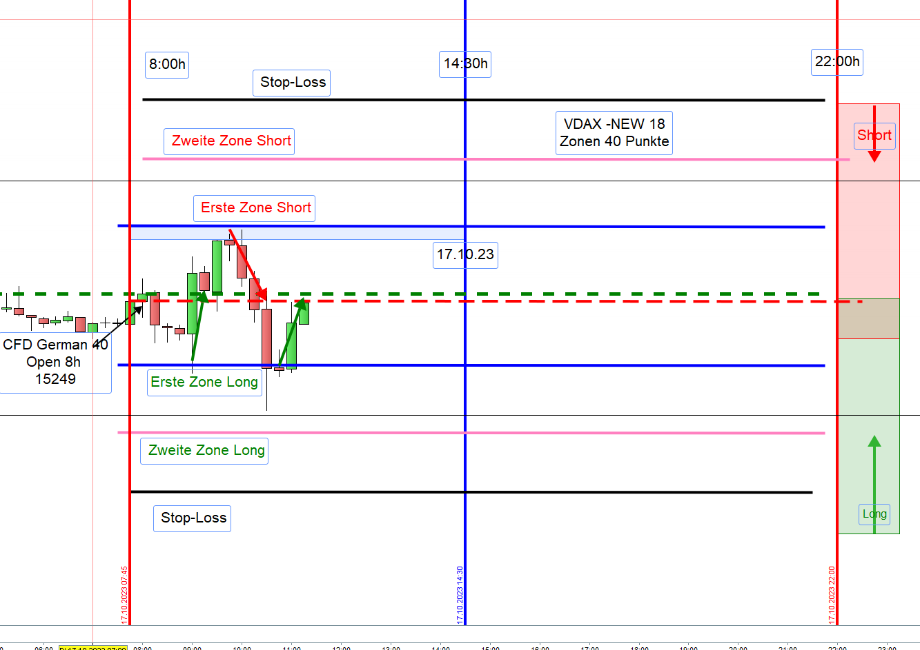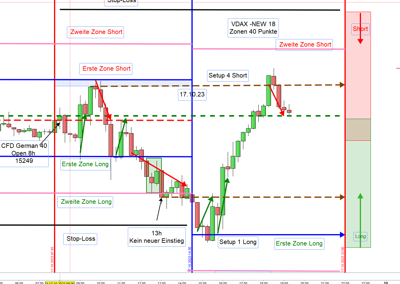 Damit wird klar, dass eine Programmierung zu aufwendig ist. Dann geht es nur manuell. Das einlegen des Vortages- Schlusskurses und die Zonenranges anhand vom VDAX NEW sind am morgen gegen 06:00 Uhr vorhanden. Mit den Eröffnungskurs am Morgen um 08:00 Uhr können die Zonen anschliessend flott eingelegt werden.