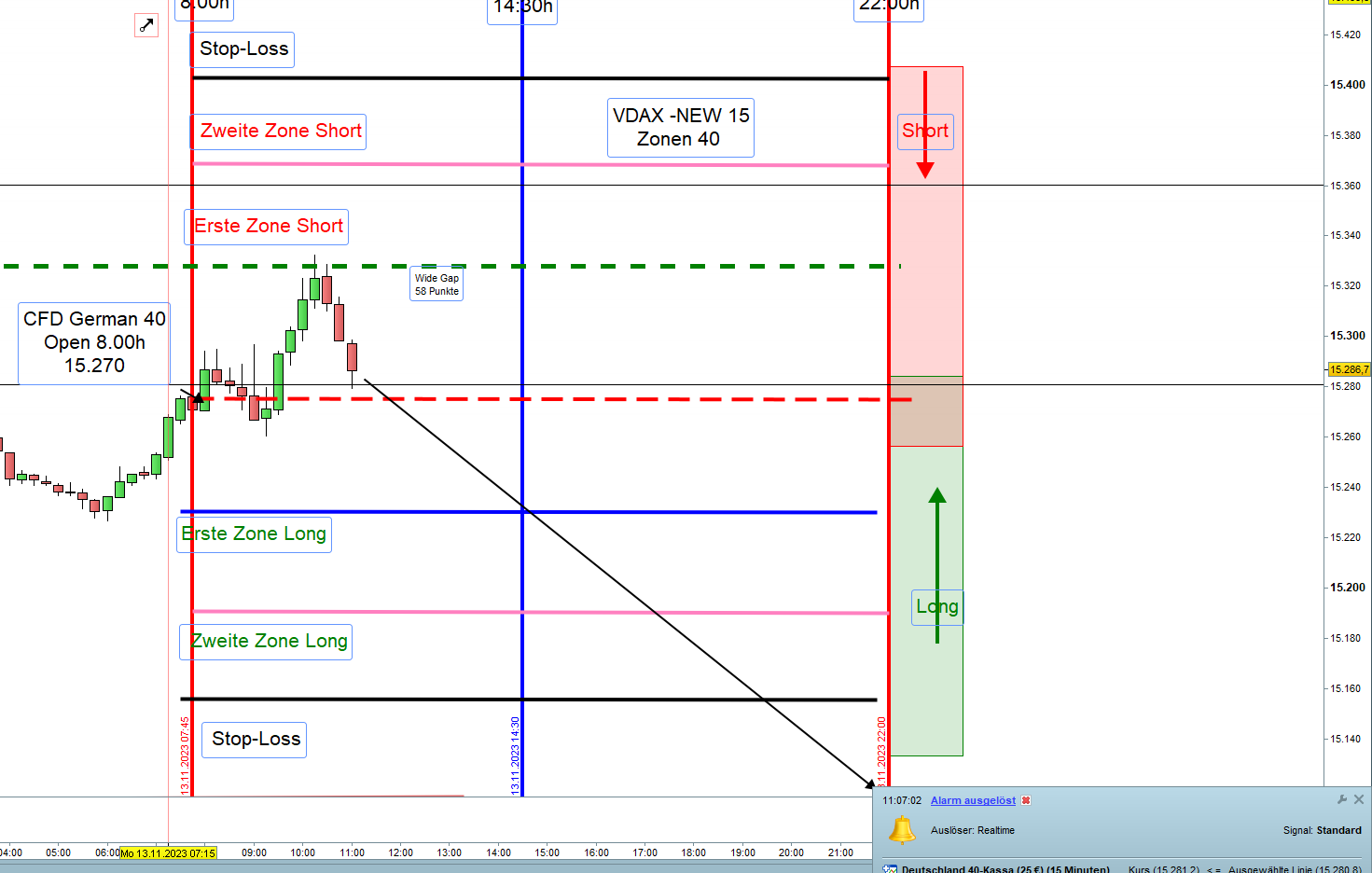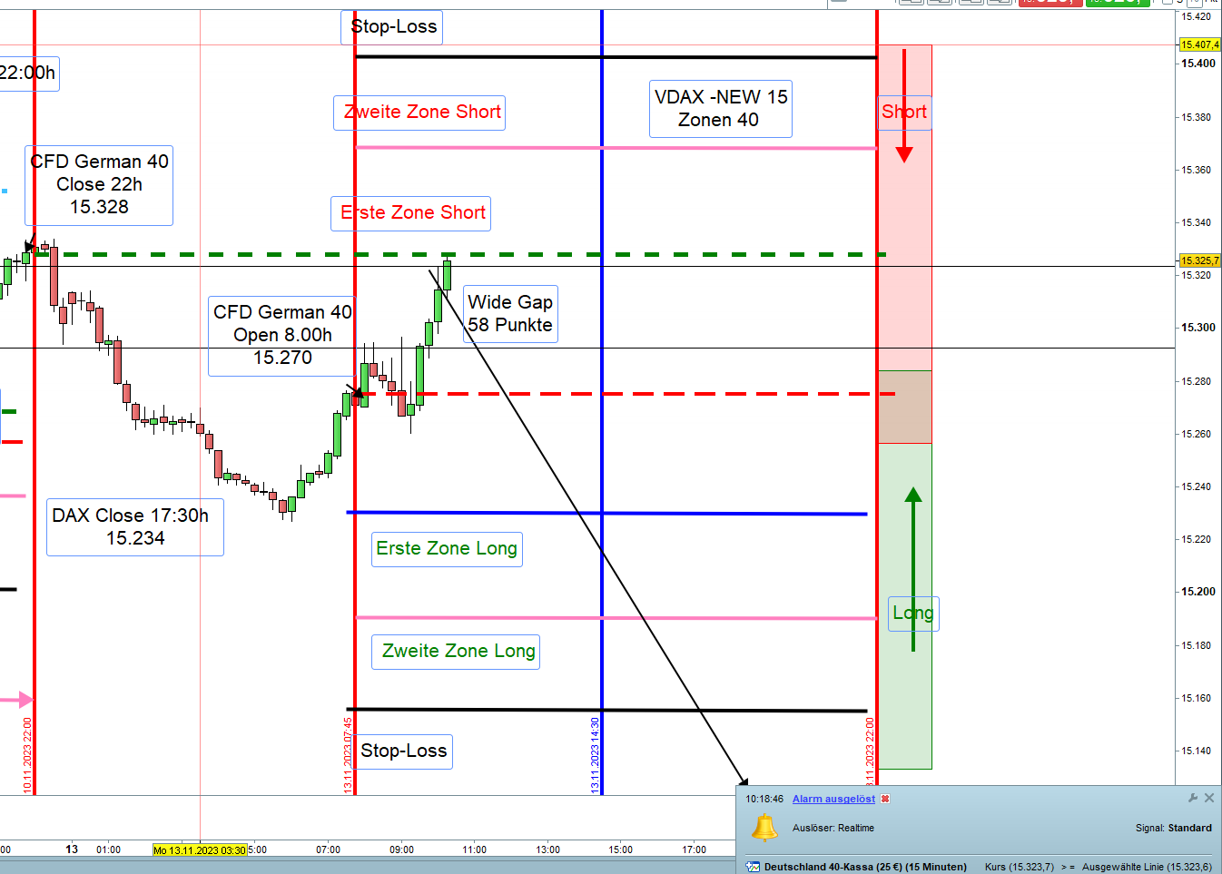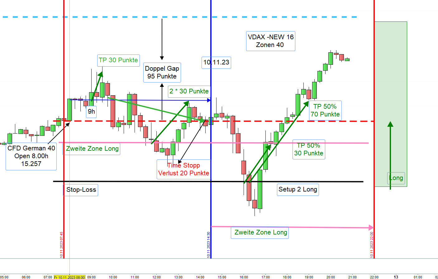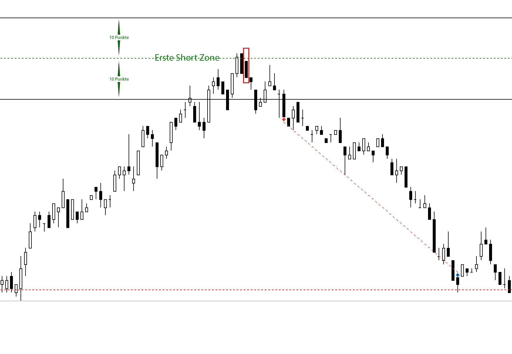ich hätte eine Frage zum FDAX-Regelwerk. Hier steht unter Punkt 13. Handelstechnik/Orderausführungen, ich zitiere: "Alternativ können geschickte Trader die Einstiege mit einer Umkehrkerze in geringer Zeiteinheit vollziehen, zum Beispiel 1M, und zwar innerhalb eines Abstands von 10 Punkten unter und über der Zonenlinie."