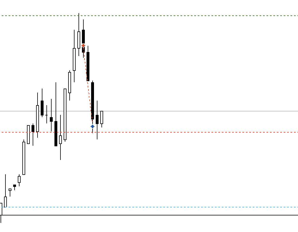 Meine Frage ist: Wie könnte eine solche Umkehrkerze aussehen, um die Wahrscheinlichkeit zu erhöhen, dass es sich wirklich um eine Umkehr handelt? Im angehängten Bild ist der 1M-Chart abgebildet. Wäre hier die zweite bärische Kerze (rot markiert) schon das Signal um short zu gehen oder eher die vierte Kerze?
