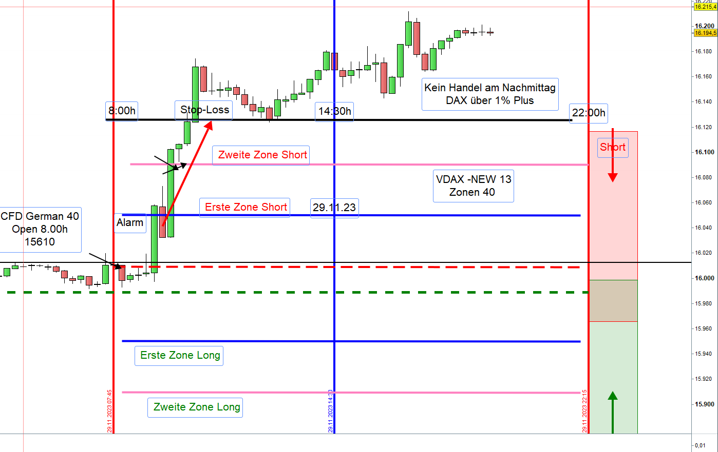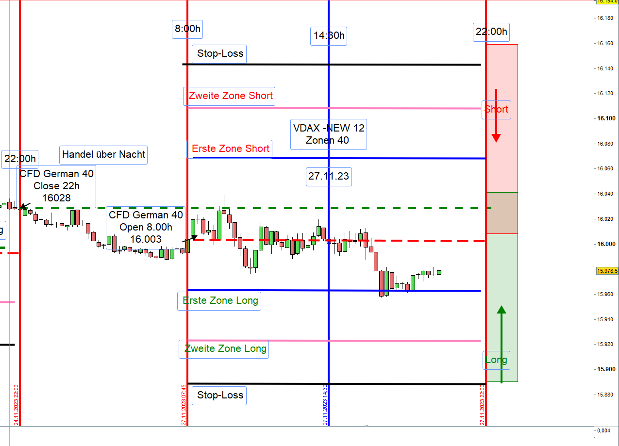 In der Handelswoche vom 13 bis 17.11.23 hat der DAX um 650 Punkte zugelegt. Ab dem 20.11.23 notiert der VDAX-NEW ,mit einer sehr engen täglischen Handelsspanne, noch niedriger