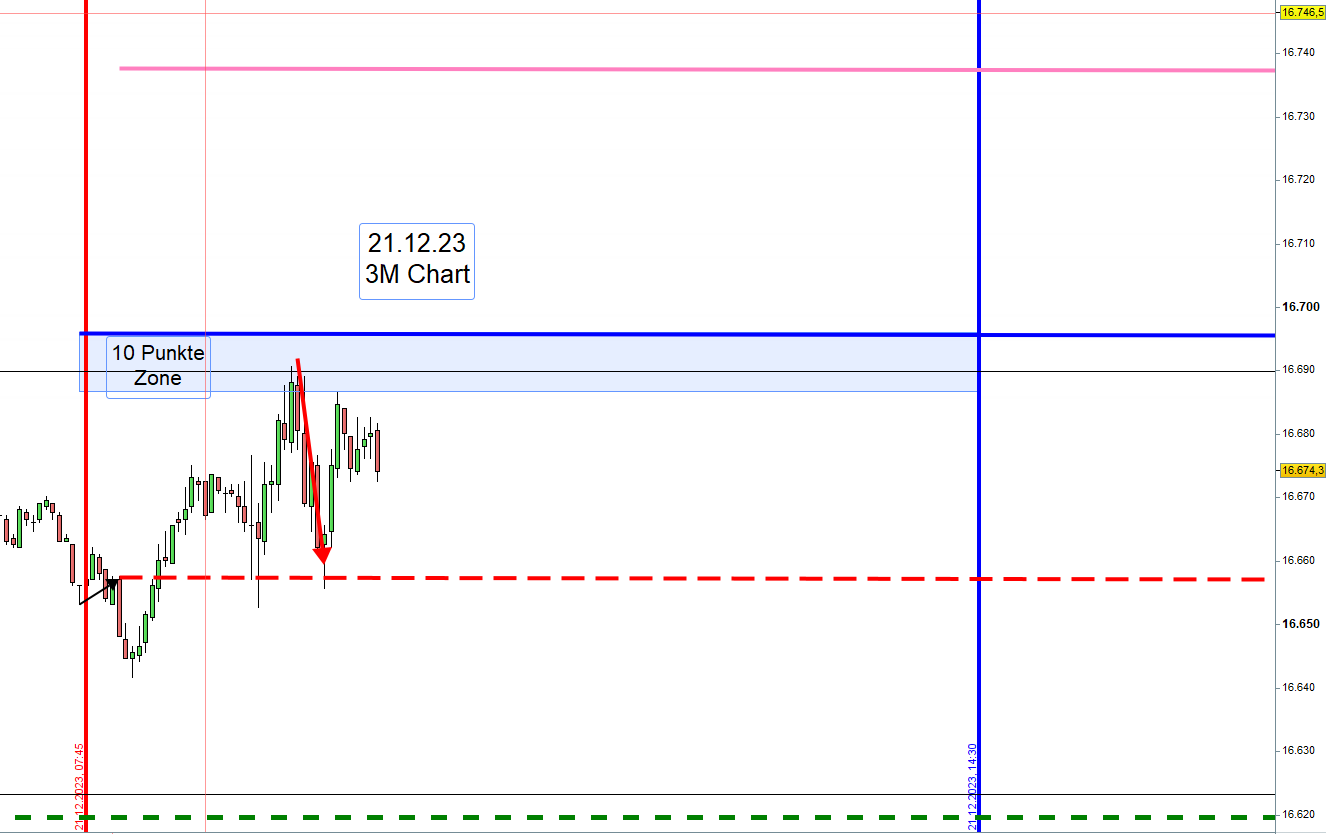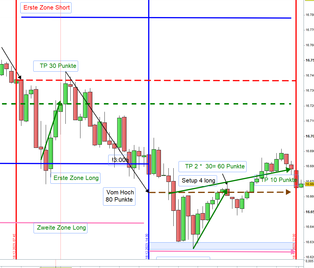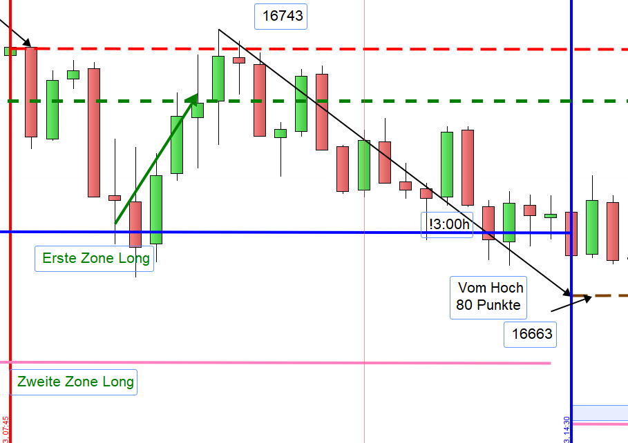 Wenn man da jetzt wirklich ein Setup 4 handeln möchte, macht es nur Sinn die Spanne von 100 Punkten zu "projizieren". Die wäre dann bei ca. 16642 - das wäre dann die zweite Zone Long vom Vormittag....