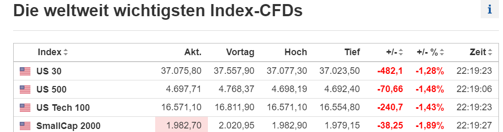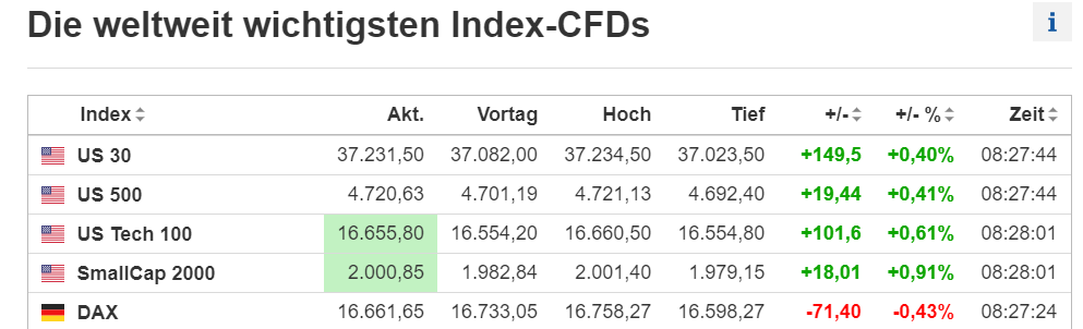 Die CFDs auf die weltweit wichtigsten Indizes werden auf den sogenannten Cash-Index gepreist. Die Index-CFDs sind 24 Stunden am Tag verfügbar mit aktuellem Kurs, Tageshoch und -tief sowie die prozentuale Veränderung für jeden Index. Der "Basispreis" ist der letzte tatsächliche Schlusskurs jedes Index und die Veränderung wird aus dieser Basis berechnet. Der Erwerber eines CFDs (Contracts for Difference) ist nicht an einem Unternehmen beteiligt, sondern lediglich Inhaber einer Forderung. Der Kurs von CFDs leitet sich von einem Basiswert ab. Der Anleger wird ausschließlich an der Kursentwicklung des Basiswertes beteiligt. CFDs zählen zur Gruppe der Derivate.