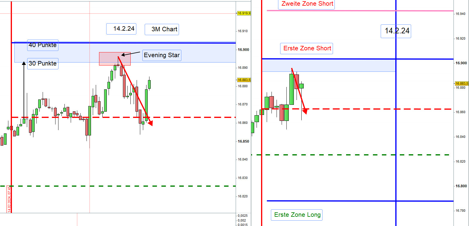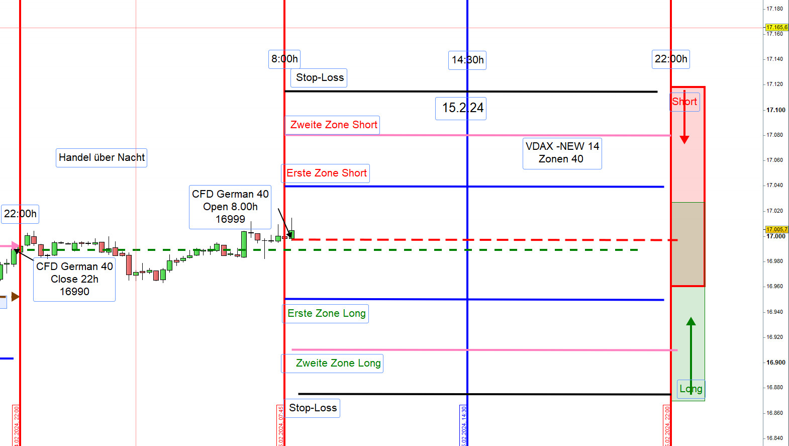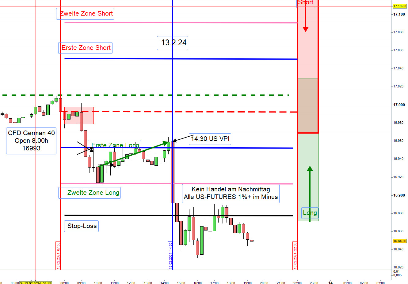 Augenmerk liegt auf der Entwicklung von DJIA FUT über Nacht und der Eröffnung XETRA-DAX um 9:00h.Trotz aller Sorgfalt kann man Verluste nicht gänzlich verhindern jedoch wesentlich verringern, und zwar durch Anpassung der Aktionszonen.