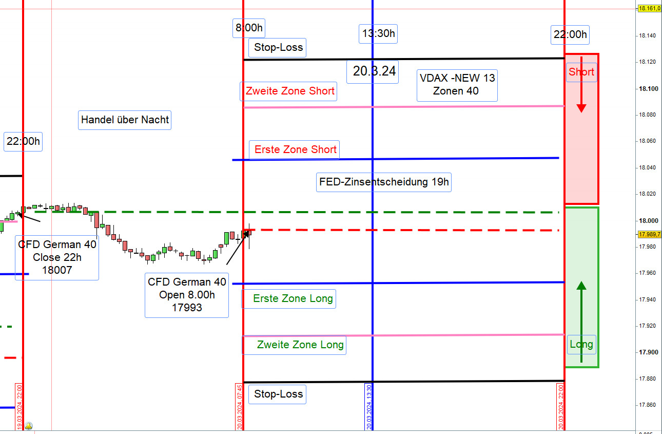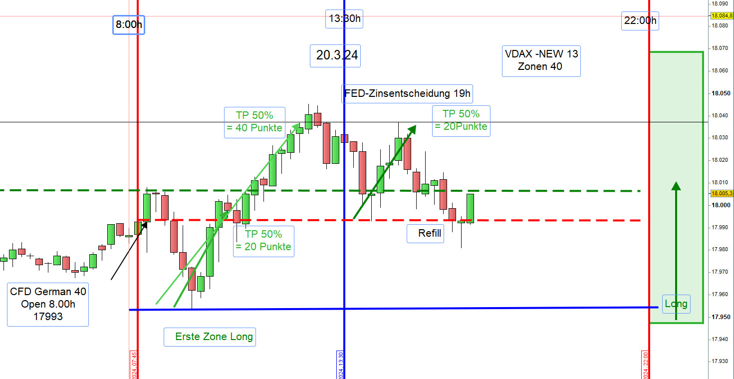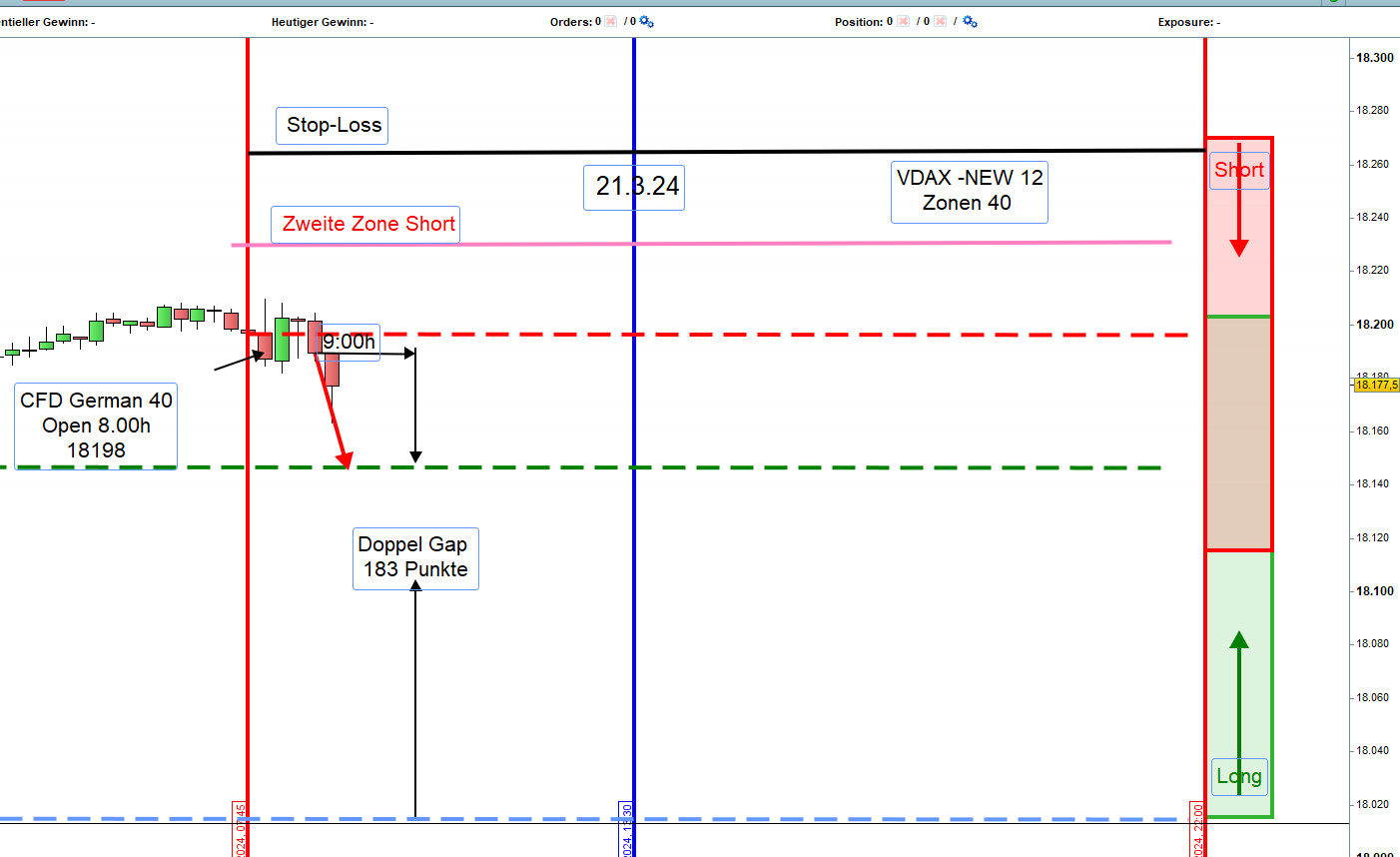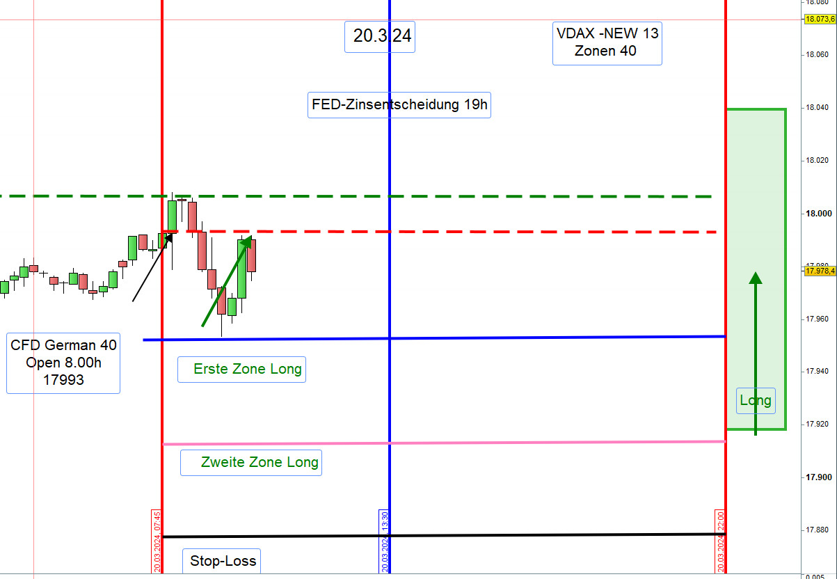 Zwischen 8h und 9h zeichnen wir die Range Hoch und Tief ein. Wird nach 9h einer dieser Referenzkurse sichtbar durchgehandelt, dann steigen wir Long ein. Es kann auch vorkommen, dass eine Position Long erst an der ersten Zone Long eröffnet wird.