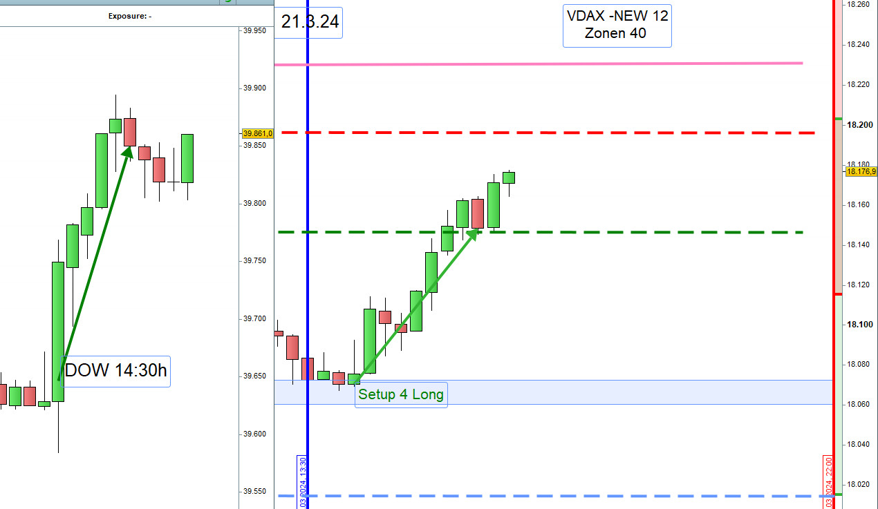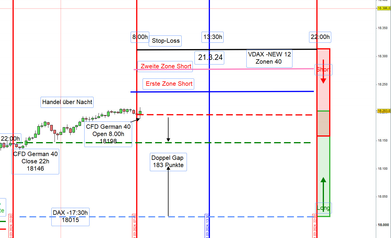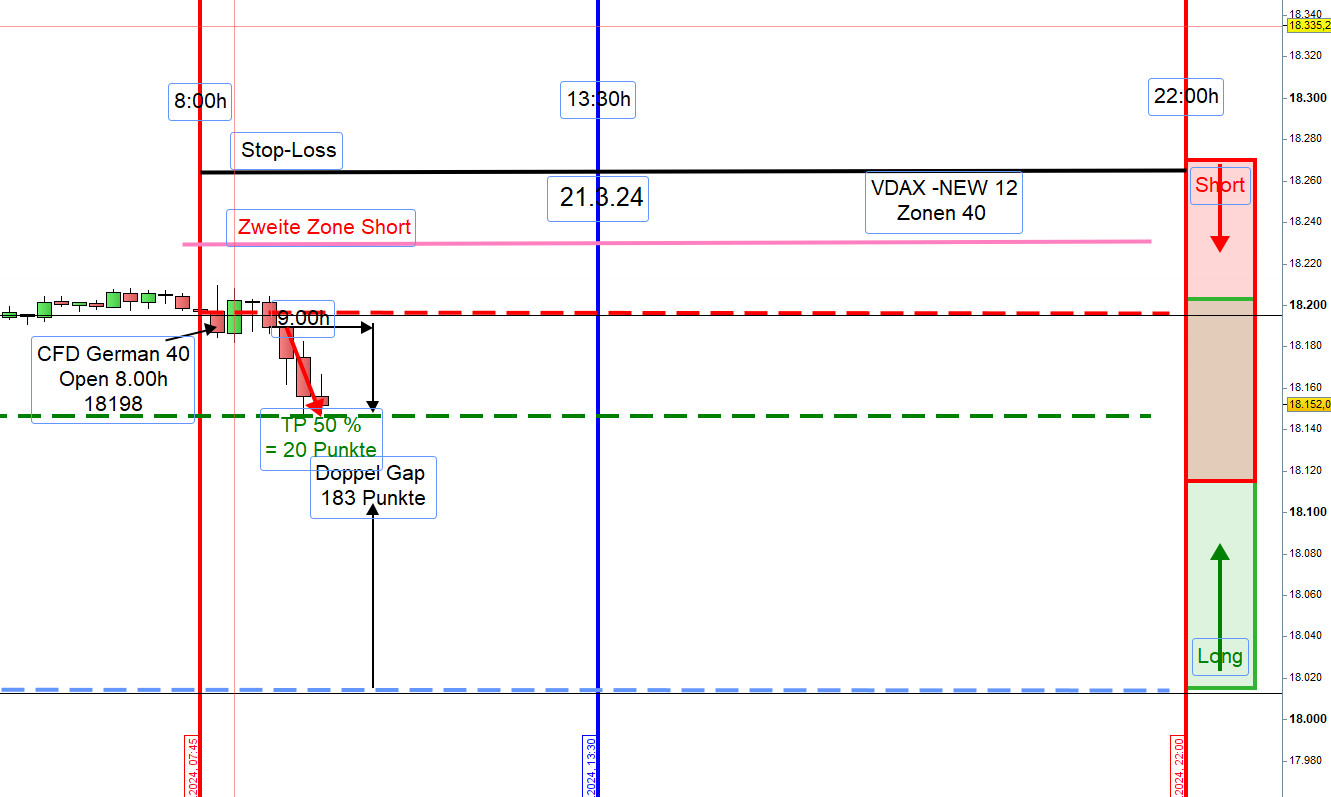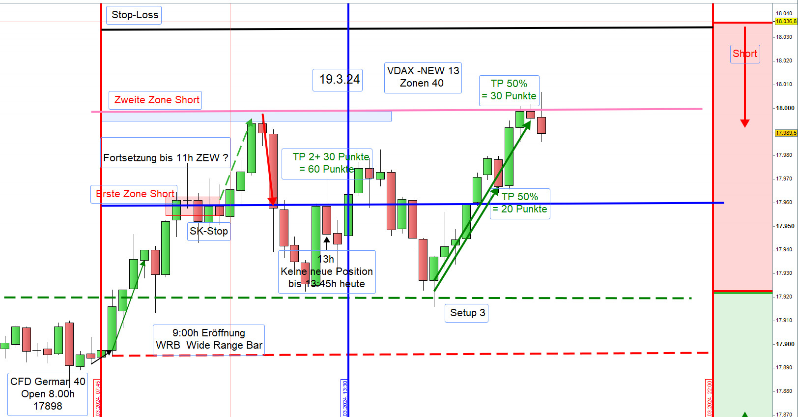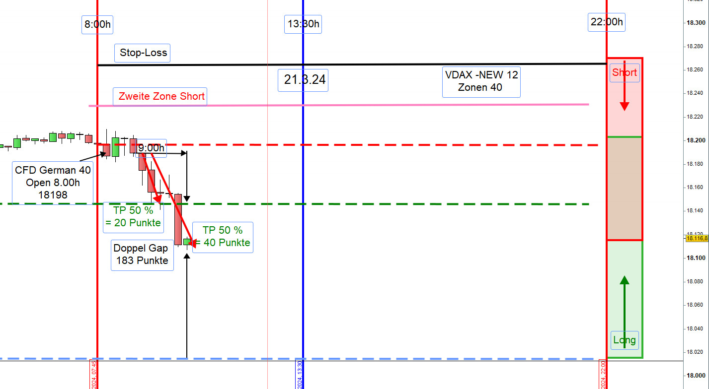 Zwischen 8h und 9h zeichnen wir die Range Hoch und Tief ein. Wird nach 9h einer dieser Referenzkurse sichtbar durchgehandelt, dann steigen wir Long ein. Es kann auch vorkommen, dass eine Position Long erst an der ersten Zone Long eröffnet wird.