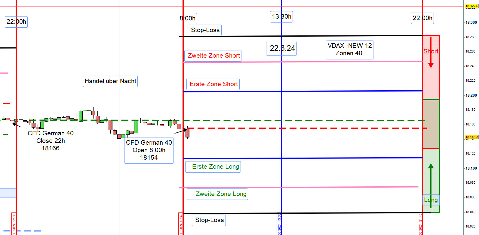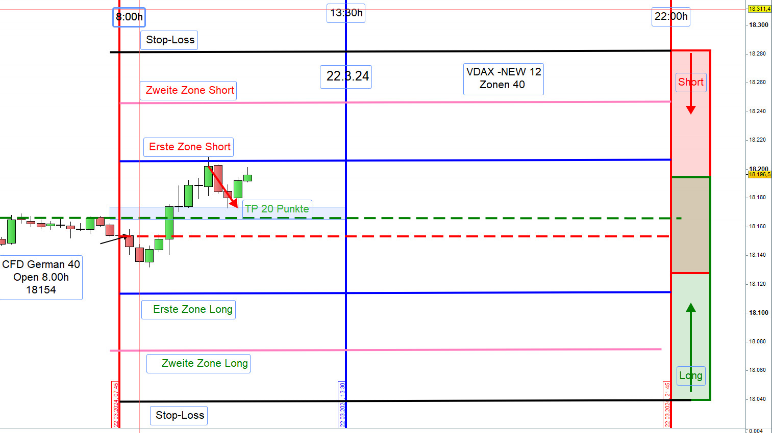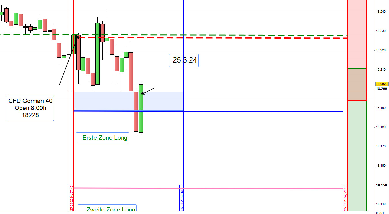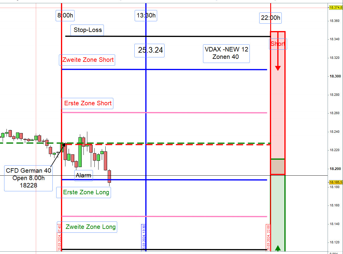 Die Linien der Aktionszonen dienen zur Orientierung. Viele Kurse durchschneiden mit Momentum die Linien. Andererseits kommt es zu einer punktgenauen Berührung der Zonen mit sofortigem Rücksetzer zum Mean. Außerdem gibt es „near misses“ von 1-3 Punkten. Damit ein Einstieg nicht zu früh erfolgt bzw. nicht ausgeführt wird können, insbesondere für Neueinsteiger, die Orderausführungen wie folgt erfolgen. Nach dem Eröffnungskurs um 8:00h werden die Zonen eingezeichnet und 5 Punkte vor den Zonen ein Alarm gesetzt.Ebenso halten wir Stopp Sell oder Stopp Buy Orders bereit, und zwar 5 Punkte über dem Alarm für Long und unter dem Alarm für Short. Ertönt der Alarm wird die Order abgesetzt. Die Ausführung erfolgt, wenn der Kurs dieses Ziel erreicht. Wird der Kurs durchgehandelt dann wird die Order nicht oder später ausgeführt. -