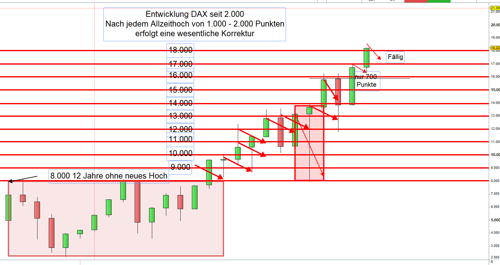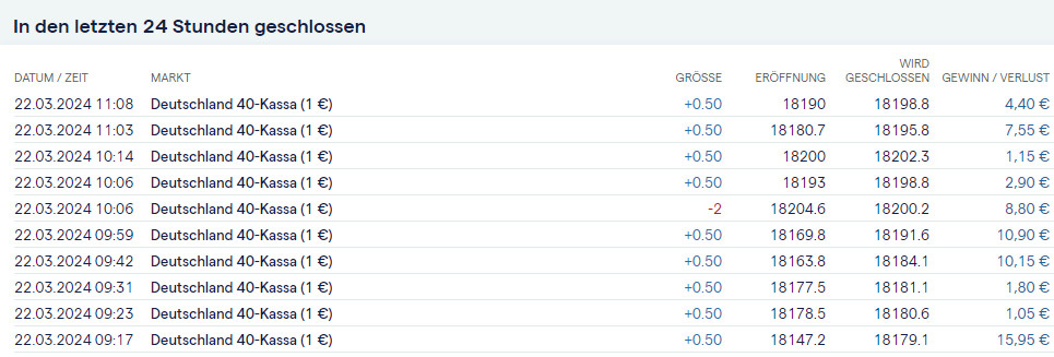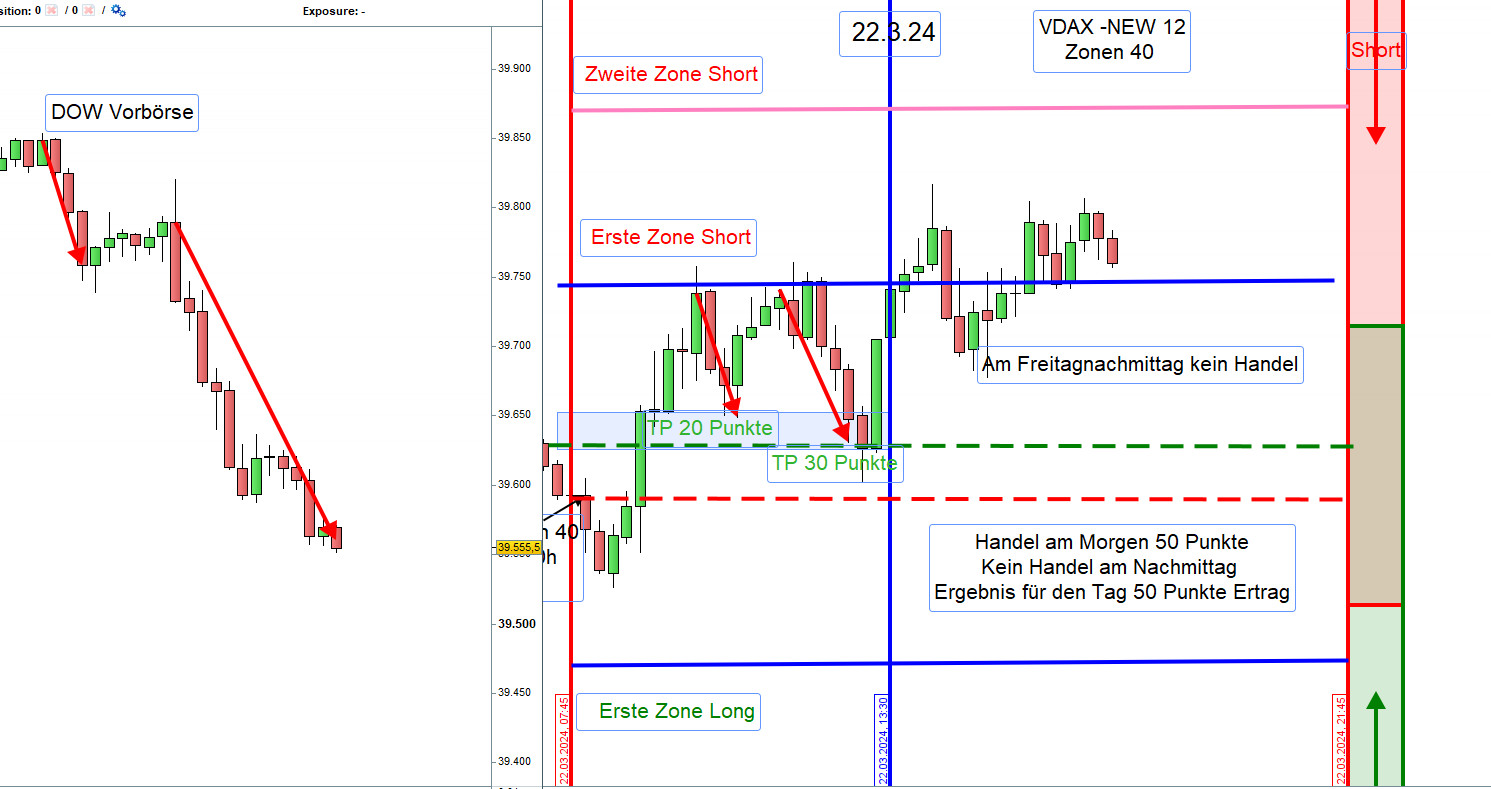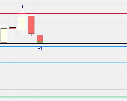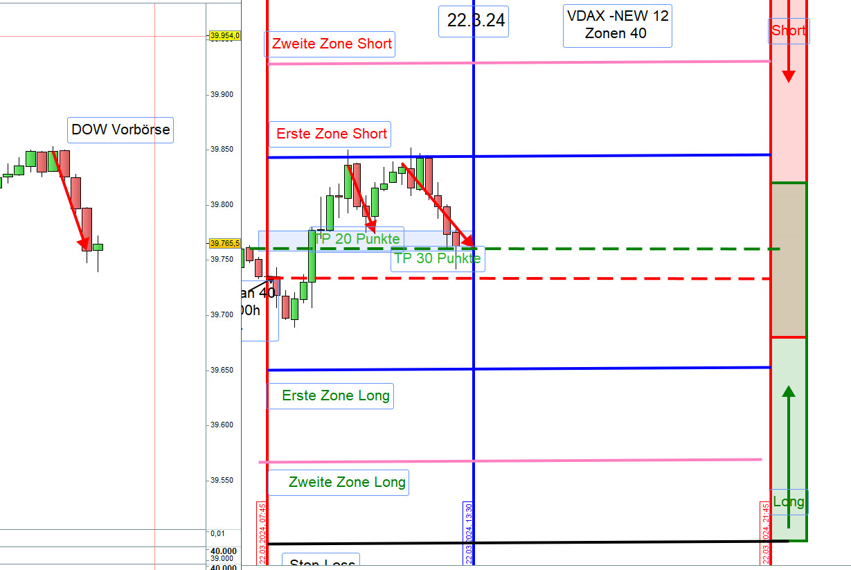 Die Linien der Aktionszonen dienen zur Orientierung. Viele Kurse durchschneiden mit Momentum die Linien. Andererseits kommt es zu einer punktgenauen Berührung der Zonen mit sofortigem Rücksetzer zum Mean. Außerdem gibt es „near misses“ von 1-3 Punkten. Damit ein Einstieg nicht zu früh erfolgt bzw. nicht ausgeführt wird können, insbesondere für Neueinsteiger, die Orderausführungen wie folgt erfolgen. Nach dem Eröffnungskurs um 8:00h werden die Zonen eingezeichnet und 5 Punkte vor den Zonen ein Alarm gesetzt.Ebenso halten wir Stopp Sell oder Stopp Buy Orders bereit, und zwar 5 Punkte über dem Alarm für Long und unter dem Alarm für Short. Ertönt der Alarm wird die Order abgesetzt. Die Ausführung erfolgt, wenn der Kurs dieses Ziel erreicht. Wird der Kurs durchgehandelt dann wird die Order nicht oder später ausgeführt. -