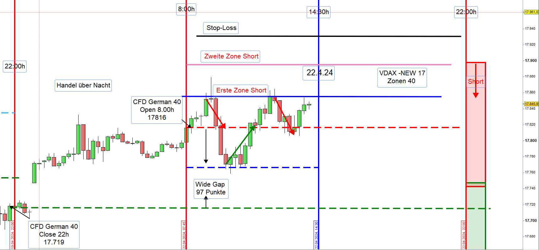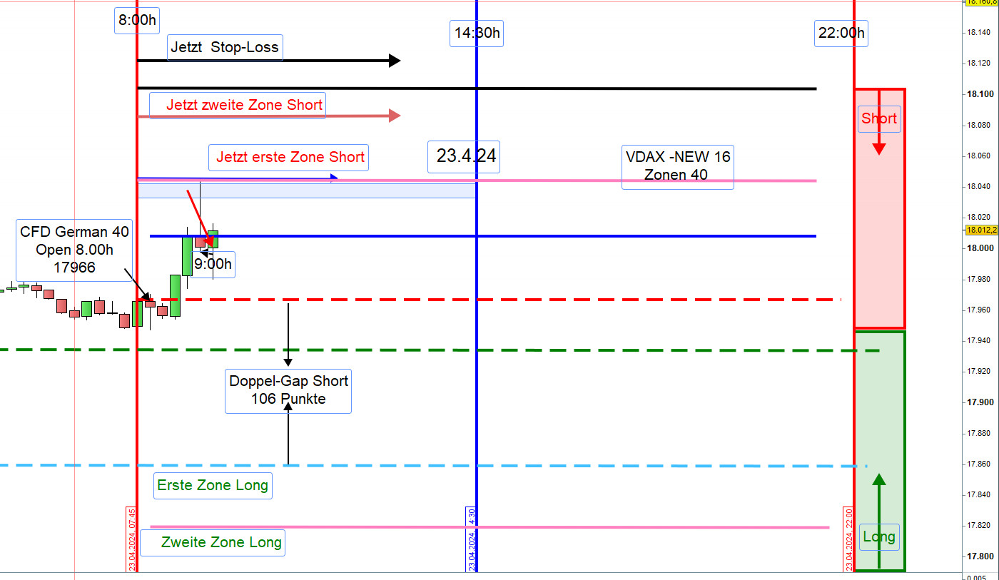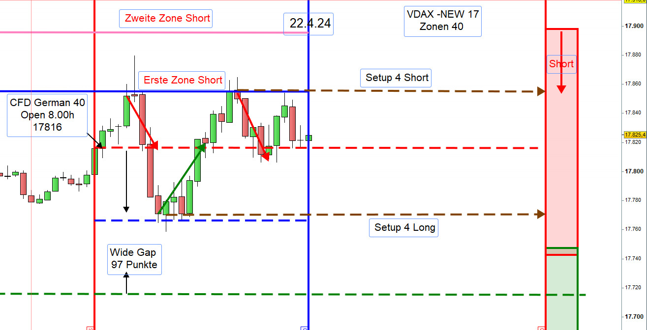 Auch heute haben wir wiederum ein Doppel-Gap und nach meiner Einschätzung sollten wir den Morgen wie ein Wide-Gap handeln. Das bedeutet Long am Schlusskurs von gestern und Short an den Zonen.