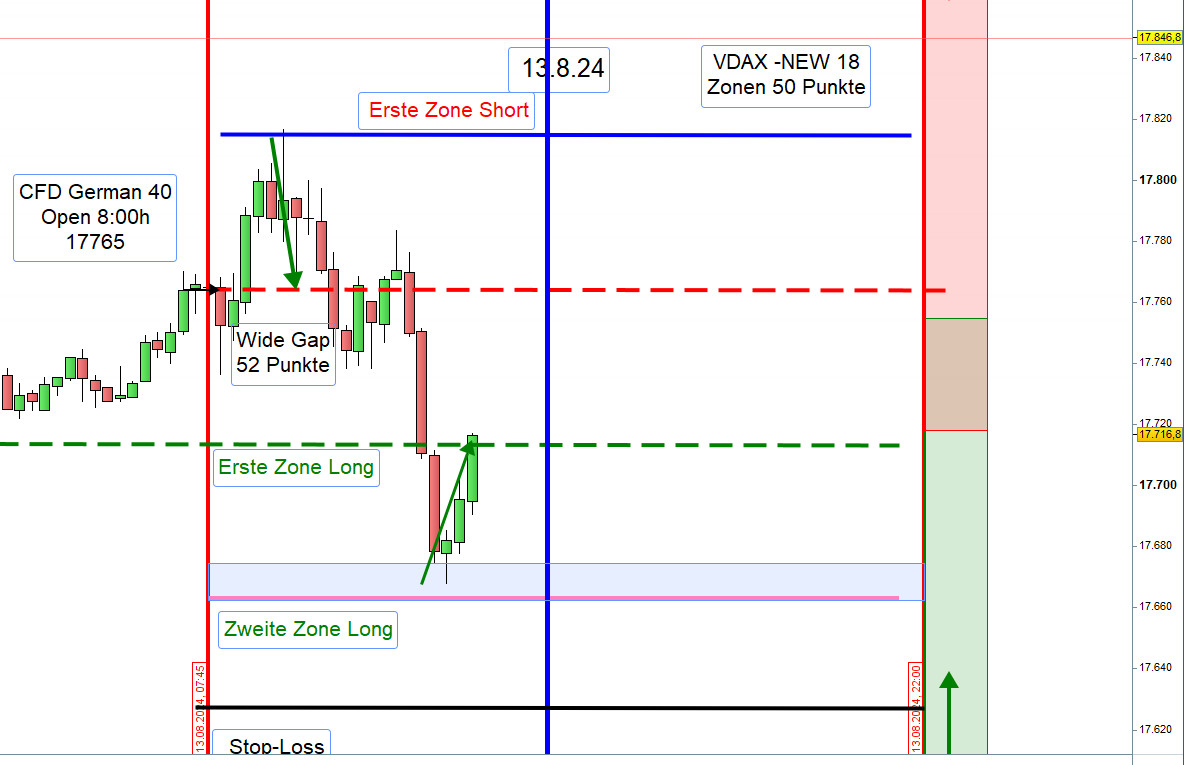 Die Eröffnung einer Position erfolgt gemäß dem Prinzip des Zonenhandels. Wurde die Position eröffnet, dann ist dies die erste Zone. Das Augenmerk liegt auf der Kursbewegung ab 9:00h, Eröffnung XETRA-Börse. Wird die Wide-Gap zügig durchgehandelt, dann erfolgt der Einstieg erst nach einer bullish oder bearish Umkehr-Kerze. Hammer und Inverted Hammer -
