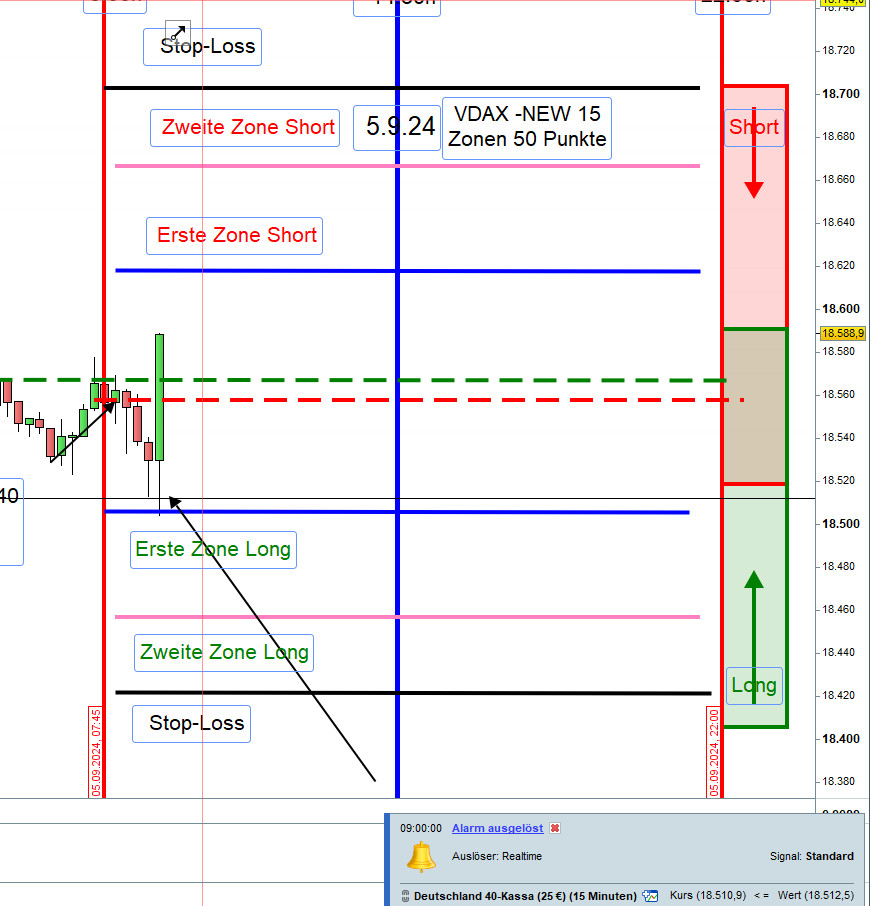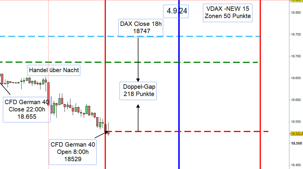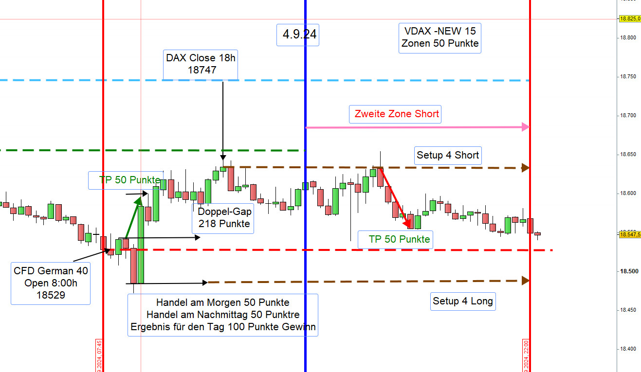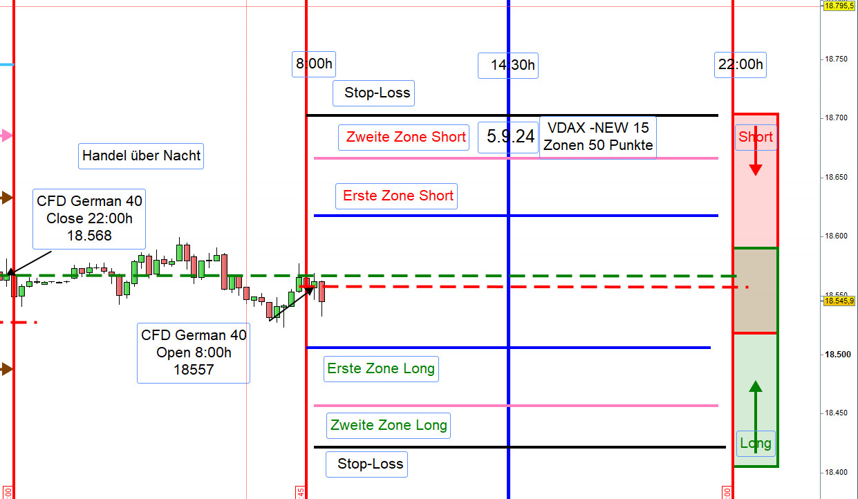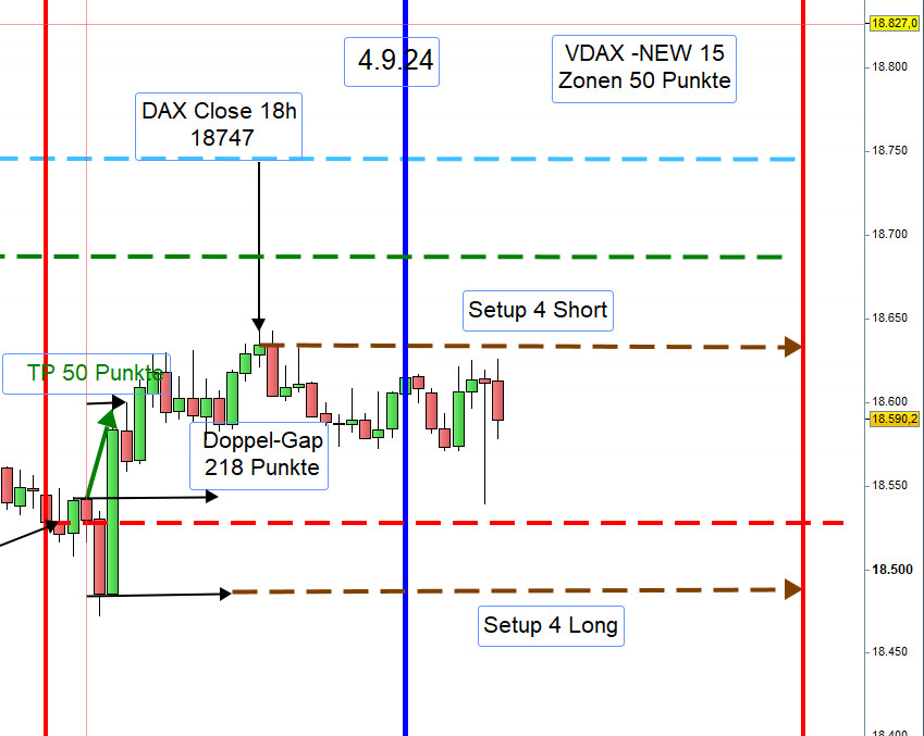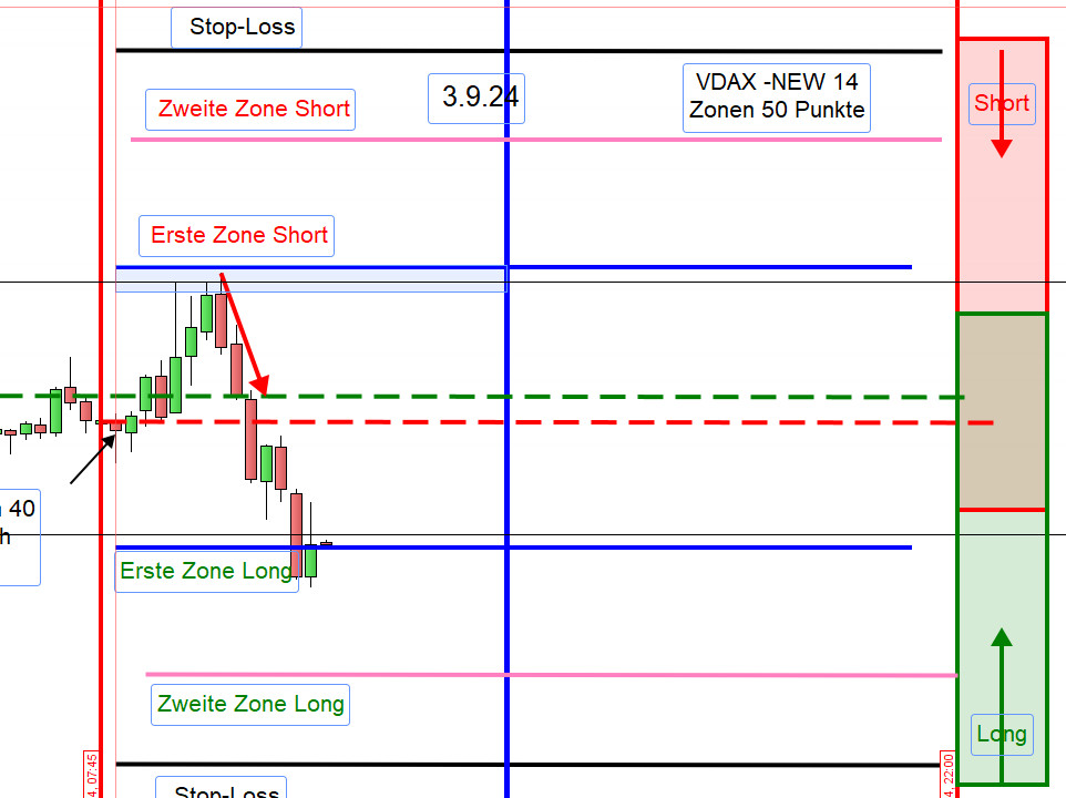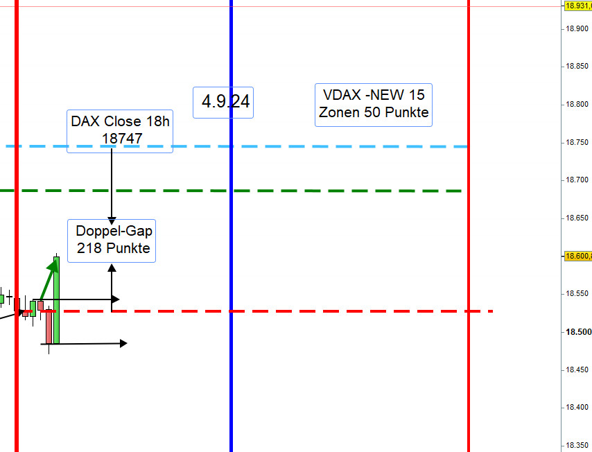 Der Handel beginnt erst ab 9:00h (Eröffnung XETRA DAX.) Der Einstieg muss charttechnisch korrekt sein und durch eine bullish oder bearish Candlestick-Kerze bestätigt werden. Dies kann unter dem Eröffnungskurs für Long und invers über dem Eröffnungskurs für Short sein. Aber auch für Long ein Ausbruch über dem Hoch zwischen 8-9h oder invers für Short sein. Nach Eröffnung einer Position ist dies dann die erste Zone. Teilgewinne ab 30 Punkte mitnehmen. Bei einem Rücklauf kann die Position wieder aufgefüllt werden (Refill). Verdopplung der Position, sofern die zweite Zone erreicht wird.Für beide Gap Ansätze liegt der Stopp Loss auch 35 Punkte unter/über der zweiten Zone Notiert der VDAX über 30 wird eine Doppel-Gap nicht gehandelt, jedoch erfolgt dann der Zonenhandel mit Einteilung als Referenz der Eröffnungskurs um 8:00h. -