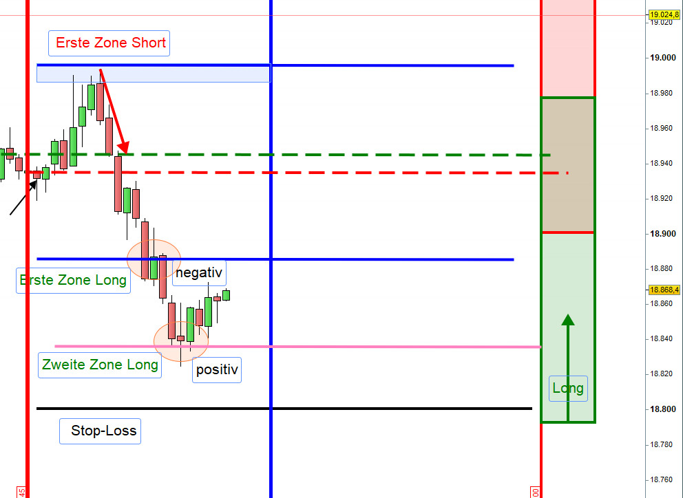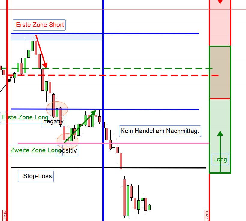 Bei Eröffnung ,wie heute, einer Long Position ist auch darauf zu achten, ob die Zonenlinie wieder unterschritten wird.