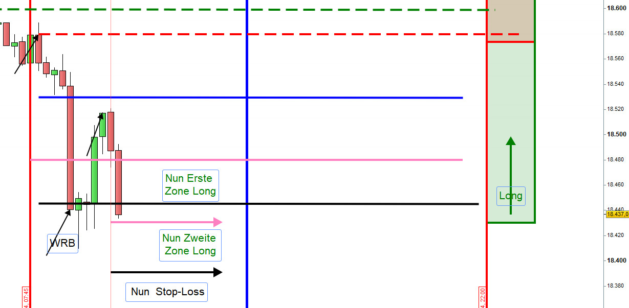 2. Eine Position, die bereits in Richtung Gewinnmitnahme 20 Punkte erreicht hat, lassen wir nicht in den Verlust laufen und setzen daher einen Stopp zum Eröffnungskurs.Wird daraufhin eine neue Position eröffnet, so muss diese unter der Aktionslinie für Long und über der Aktionszone für Short eröffnet werden. Vorteilhaft ist eine 5M Engulfing Umkehrkerze.Somit wird verhindert, dass wir gegen den Trend handeln.