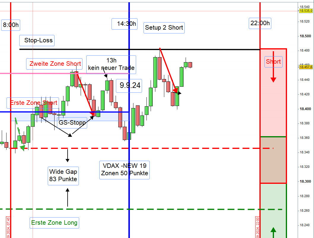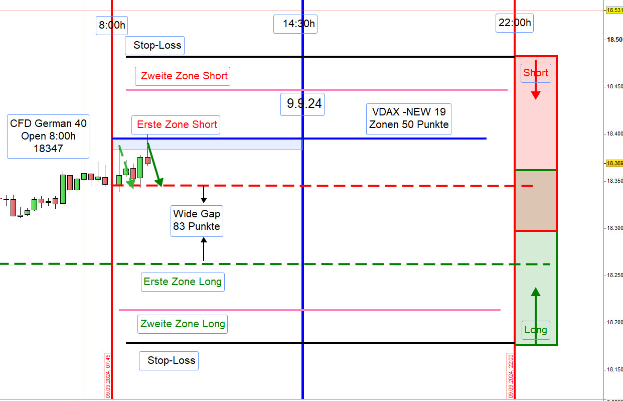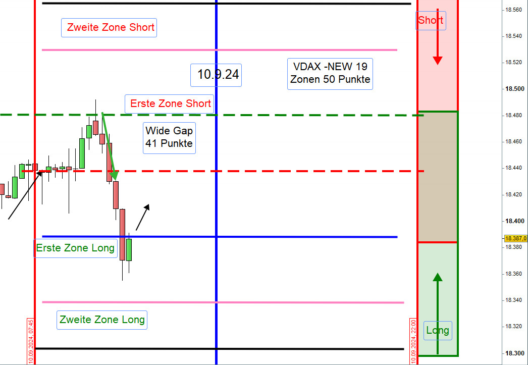 Wide-Gap Wide Gaps sind Notierungslücken zwischen dem Schlusskurs vom Vortag um 22:00h und dem Eröffnungskurs am Folgetag um 8:00h. Um als Wide-Gap zu gelten, muss die Differenz zwischen beiden Kursen +/- 40 Punkten ausmachen. Notiert jedoch der VDAX-NEW über 20 dann wird der Handel der Wide Gap erst nach einer Mindestlücke von 70 Punkten in Erwägung gezogen Gehandelt wird diese ab dem Vortagesschlusskurs, dann erste Aktionszone, mit dem Gewinnziel Eröffnungskurs um 8h. Es ist ein Revers Gap Close Handelsansatz. Die Eröffnung einer Position erfolgt gemäß dem Prinzip des Zonenhandels. Wurde die Position eröffnet, dann ist dies die erste Zone. Das Augenmerk liegt auf der Kursbewegung ab 9:00h, Eröffnung XETRA-Börse. Wird die Wide-Gap zügig durchgehandelt, dann erfolgt der Einstieg erst nach einer bullish oder bearish Umkehr-Kerze. Hammer und Inverted Hammer Teilgewinne ab 30 Punkte mitnehmen. Bei einem Rücklauf kann die Position wieder aufgefüllt werden (Refill).