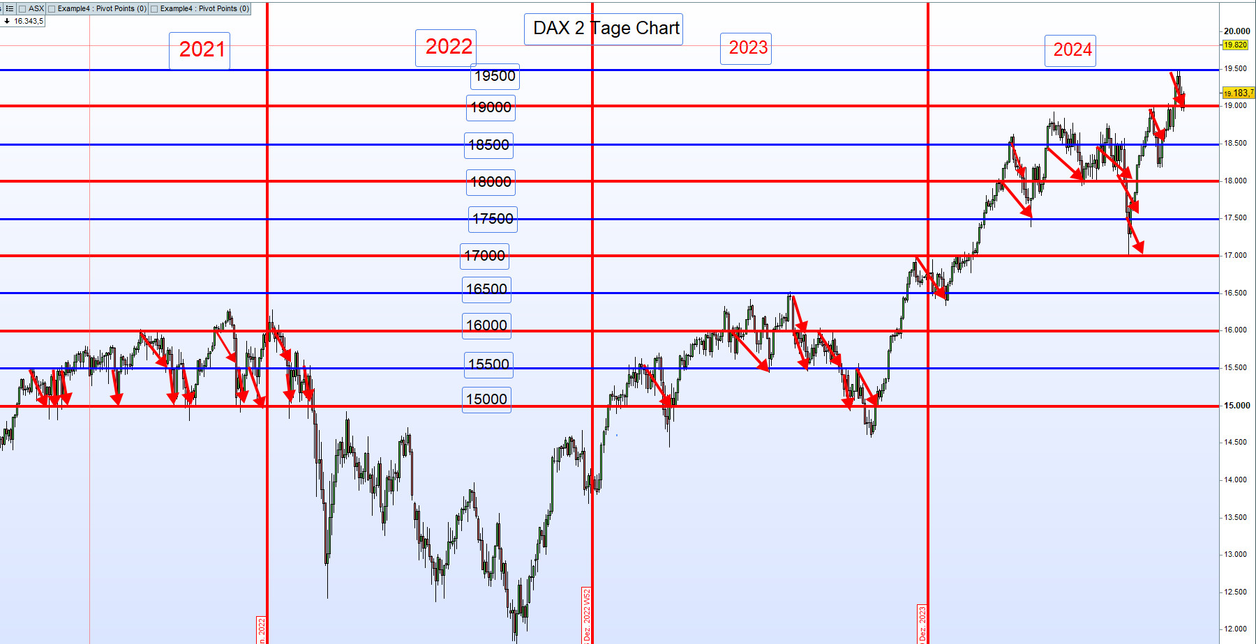 Im Jahre 2021 hat der DAX zum ersten Mal 15.000 Punkte erreicht und bis zum Hoch 2024 = 4.500 Punkte zugelegt. In dieser Berichtszeit hat der DAX 29-mal in Tranchen von 500 Punkten über 15.000 = 14.500 Punkten korrigiert.