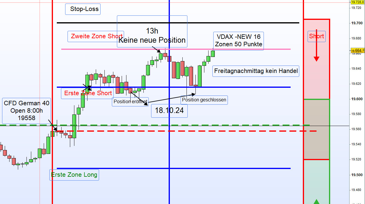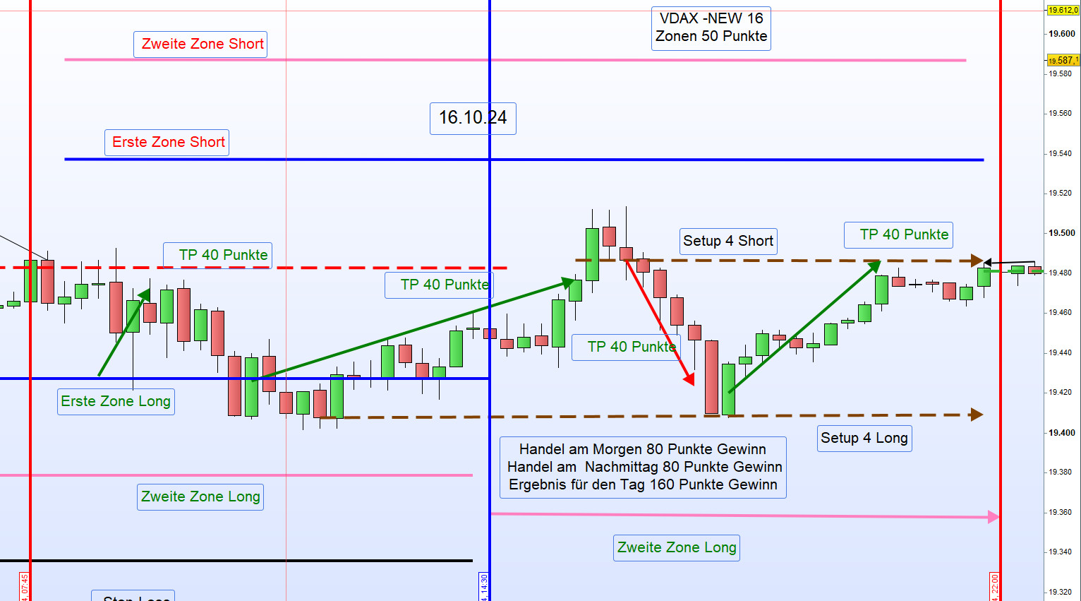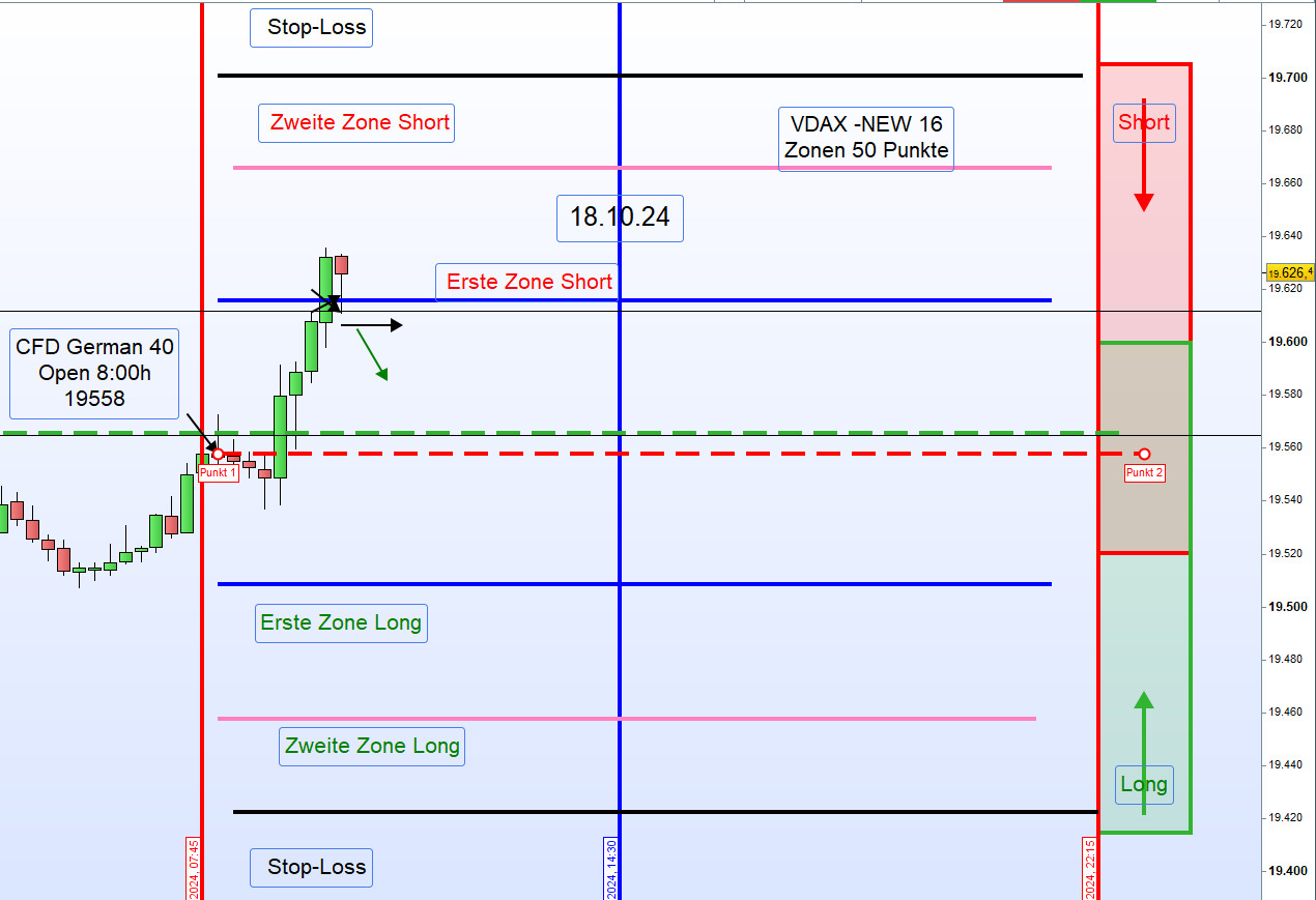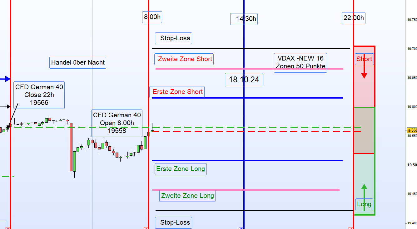 Wenn bei mir der Schlusskurs, wie heute, bei 19.566 ist, dann ist die Zonenlinie heute 19.616 . Der Alarm bei 19.611 und der Einstieg Short erfolgt nach dem Alarm bei 19.606.