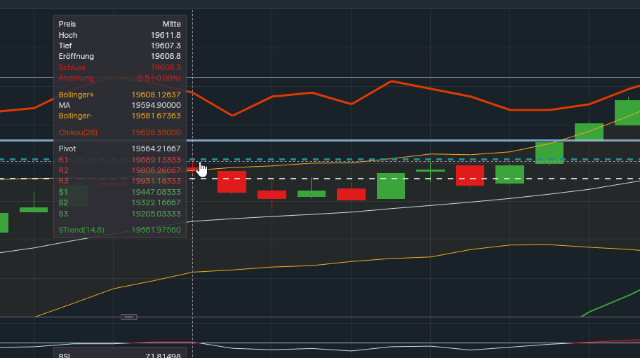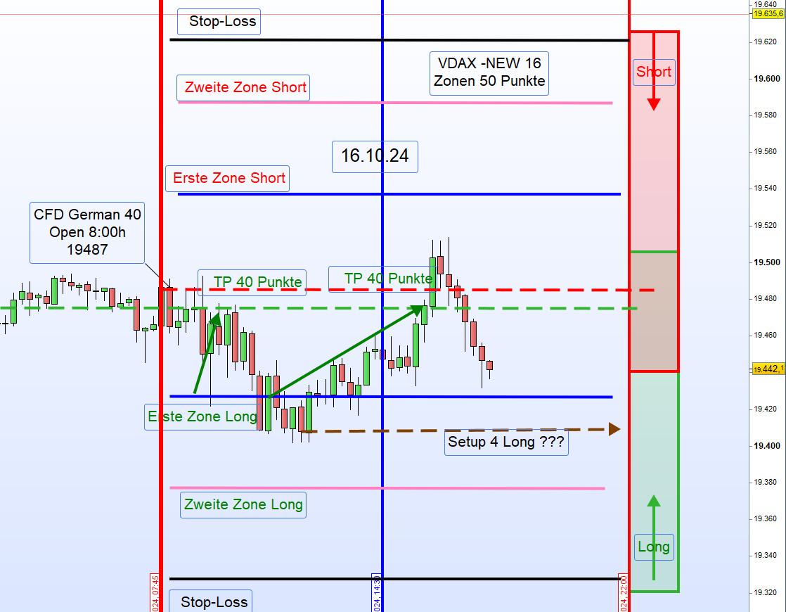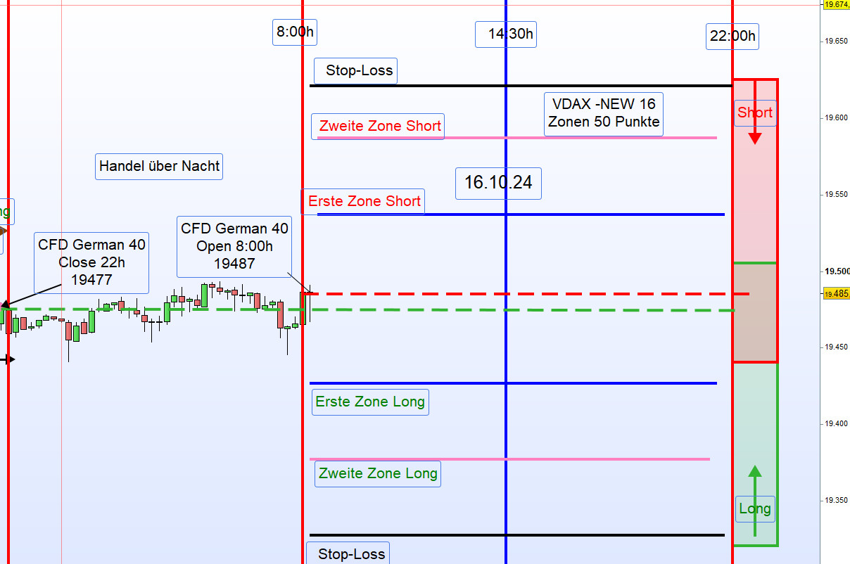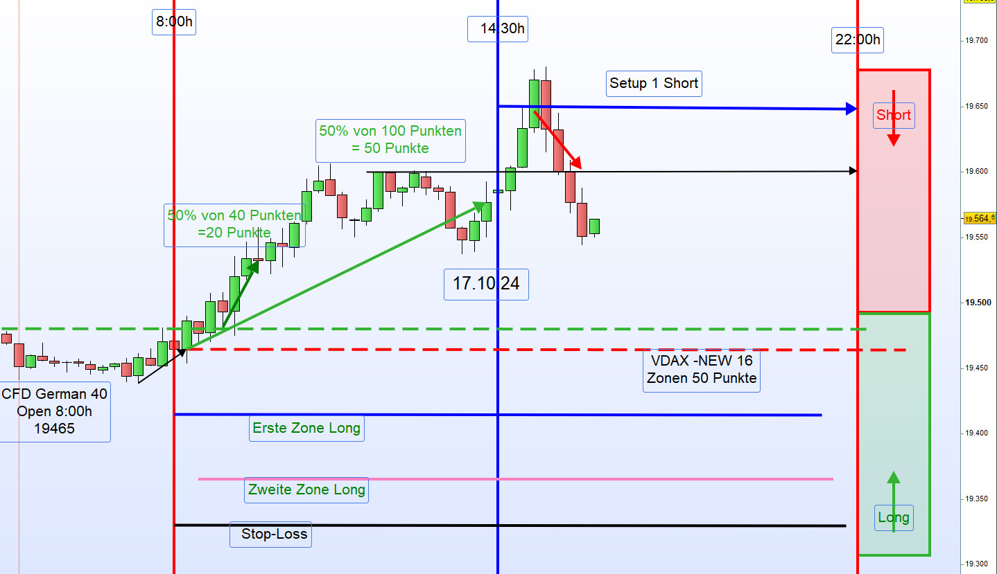 Wenn bei mir der Schlusskurs, wie heute, bei 19.566 ist, dann ist die Zonenlinie heute 19.616 . Der Alarm bei 19.611 und der Einstieg Short erfolgt nach dem Alarm bei 19.606.