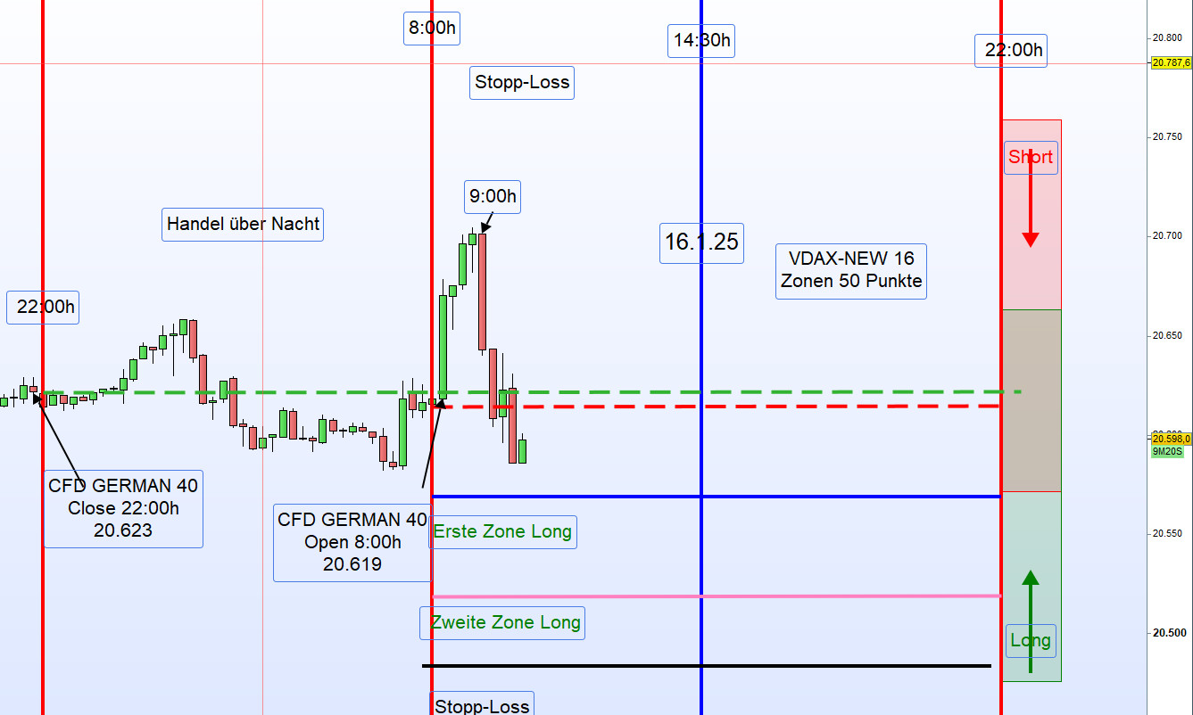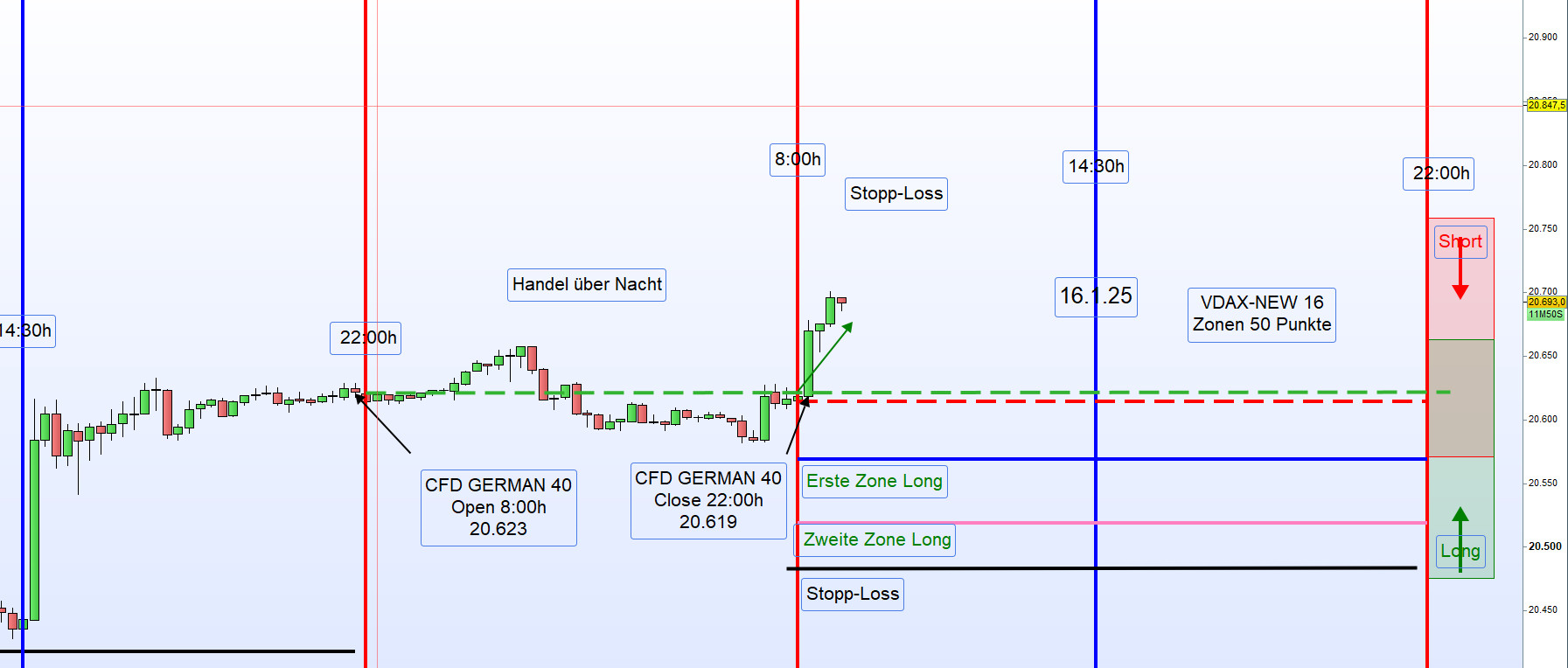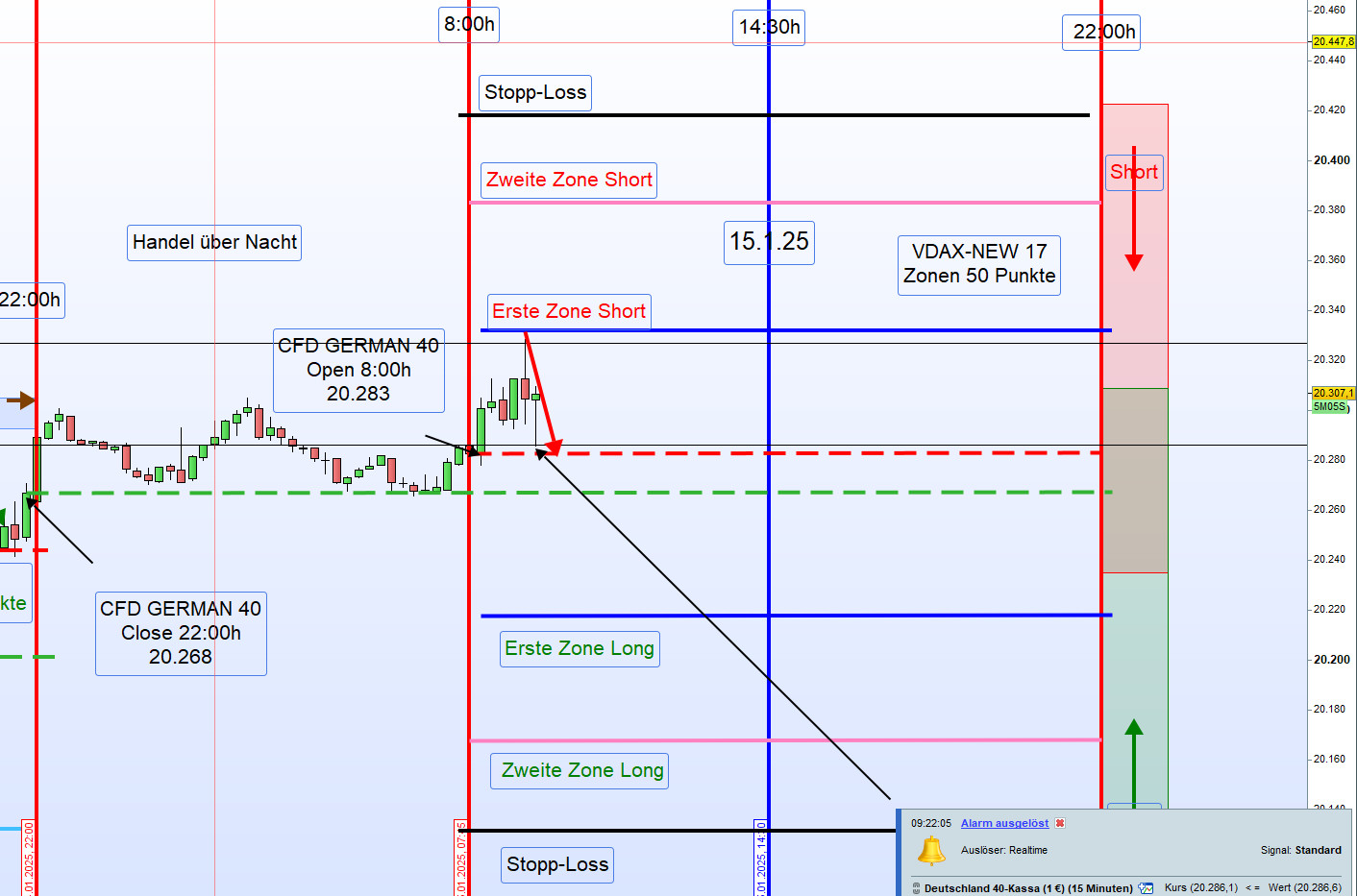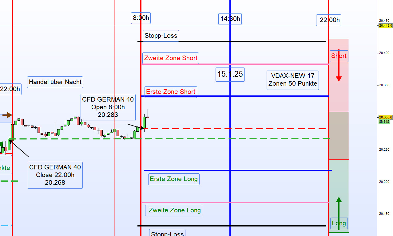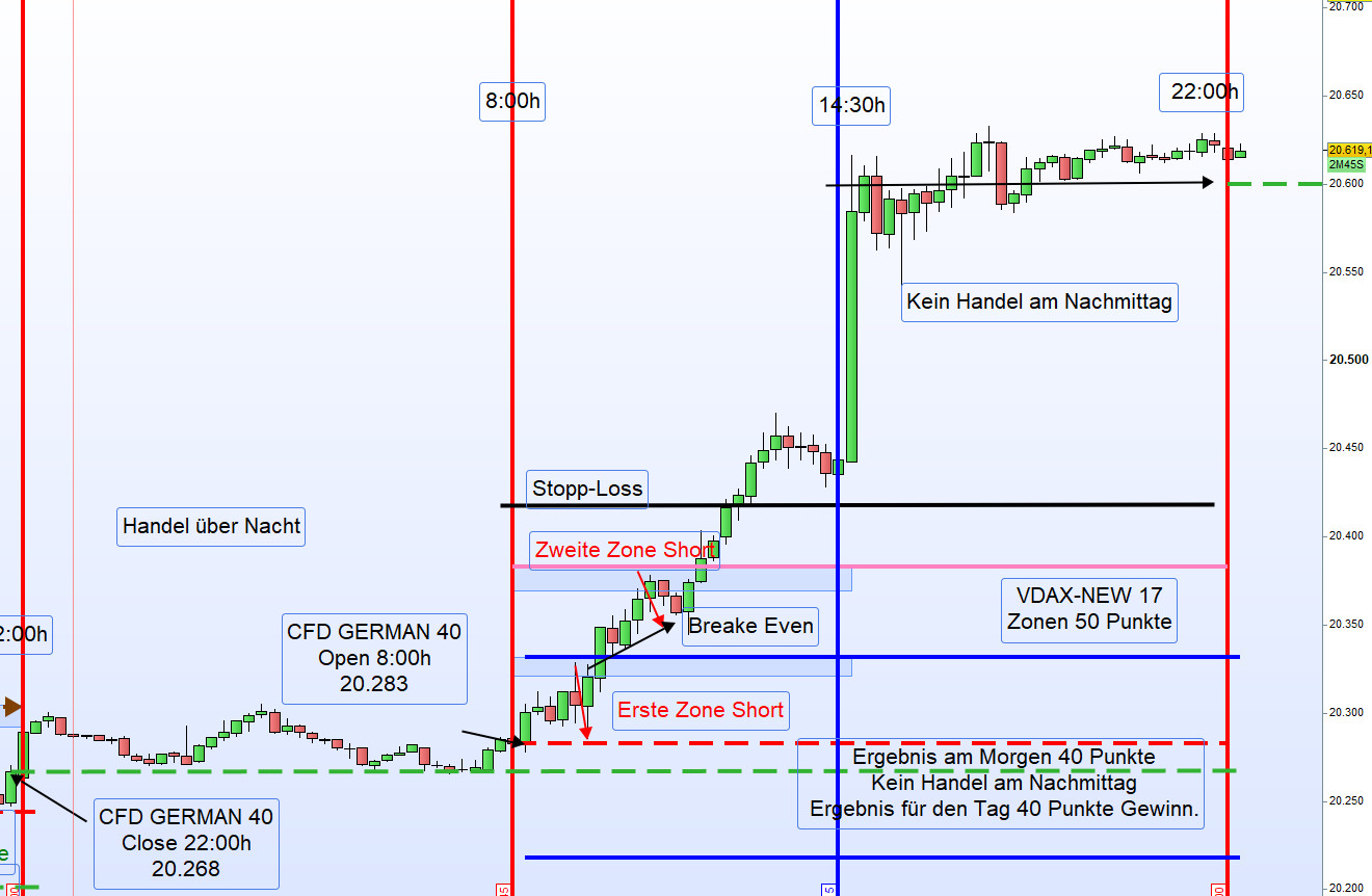 Bei einem sich abzeichnenden Trendtag (Long/Short) wird im DAX-Handel aus Sicherheitsgründen erst nach 9:00 Uhr gehandelt, um unnötige Verluste zu vermeiden. Ein Retracement dient dann als ideale Möglichkeit, nach einer Korrektur günstig in den Trend einzusteigen. Dabei dienen die Zonen oder eine Umkehrkerze als idealer Einstieg