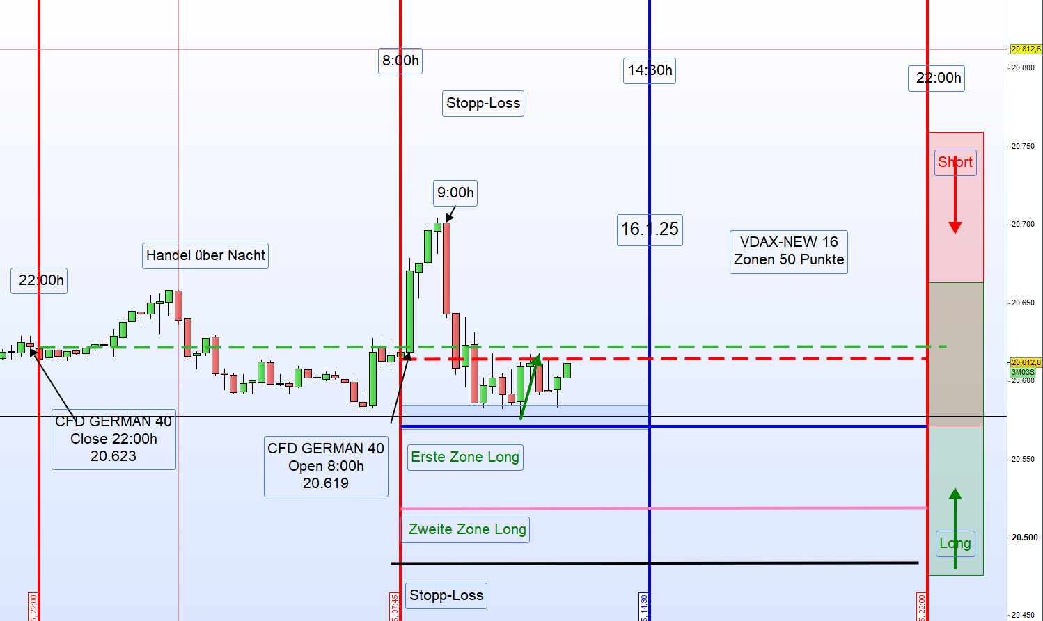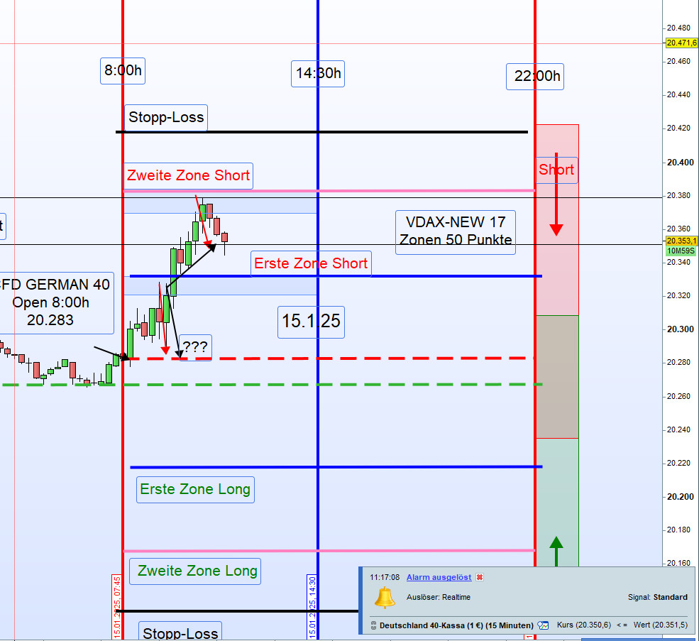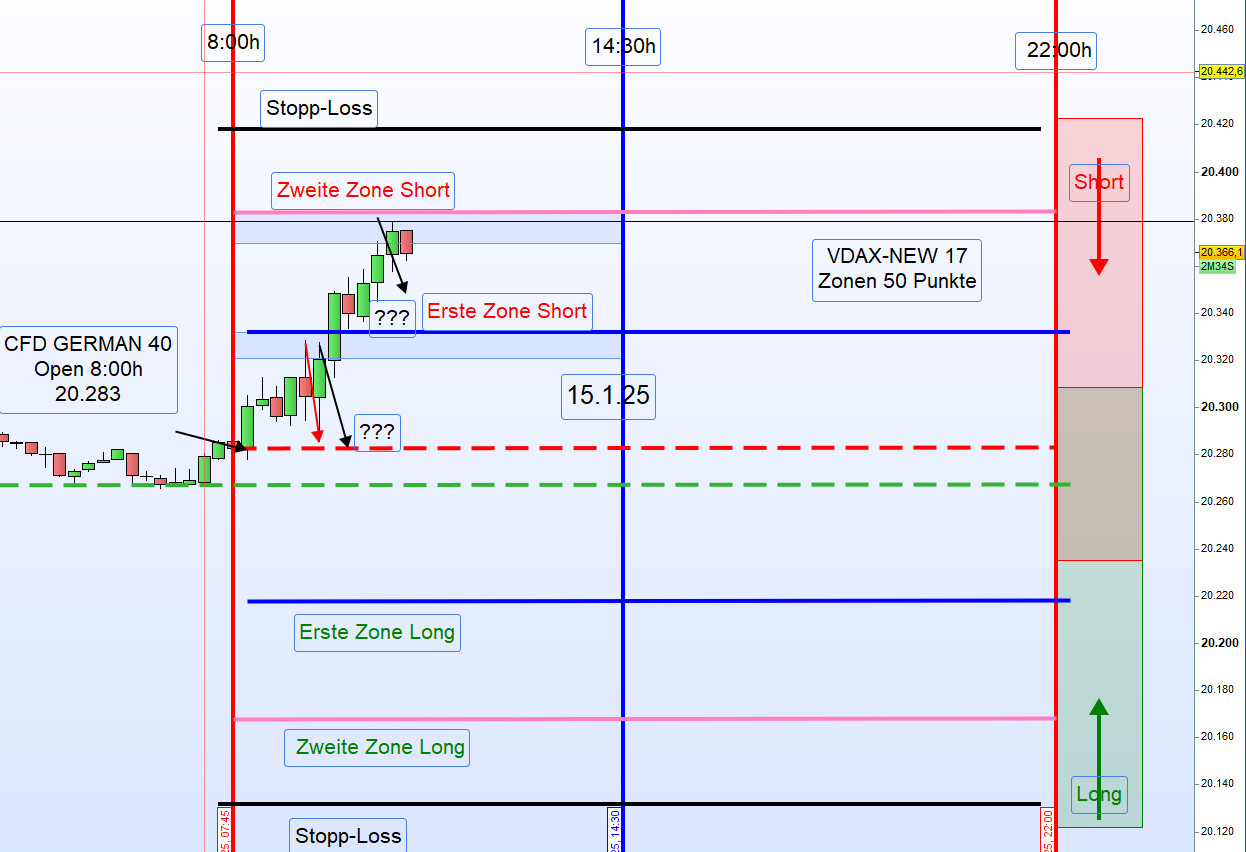 Nach dem starken Trendtag im DAX am Vortag setzte der Kurs den Eindruck einer Trendfortsetzung fort. Der Tag begann mit einem Impuls, doch es zeigte sich ein Retracement unter den Eröffnungskurs von 8 Uhr. Dies bot die erste Gelegenheit, an der ersten Aktionszone eine Long-Position zu eröffnen und dabei einen Gewinn von 40 Punkten zu erzielen.