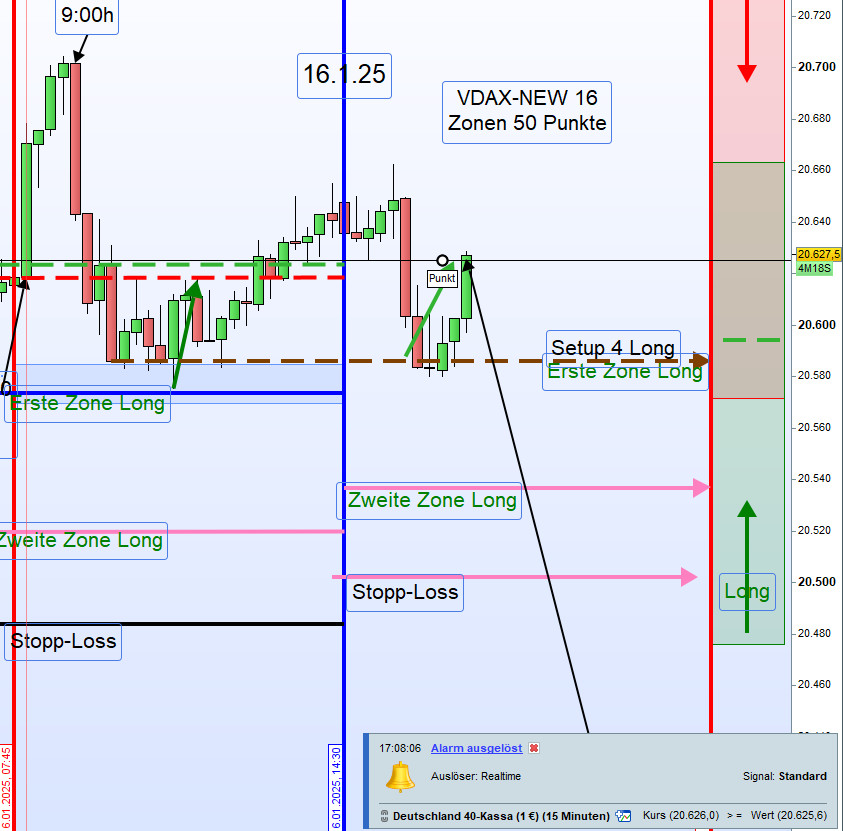 Am Nachmittag ergab sich eine weitere Gelegenheit, am Tagestief mithilfe von Setup 4 erneut eine Position zu eröffnen und ebenfalls 40 Punkte Gewinn zu realisieren. Somit wurde ein Gesamtertrag von 80 Punkten erreicht – ein erfolgreicher Handelstag.