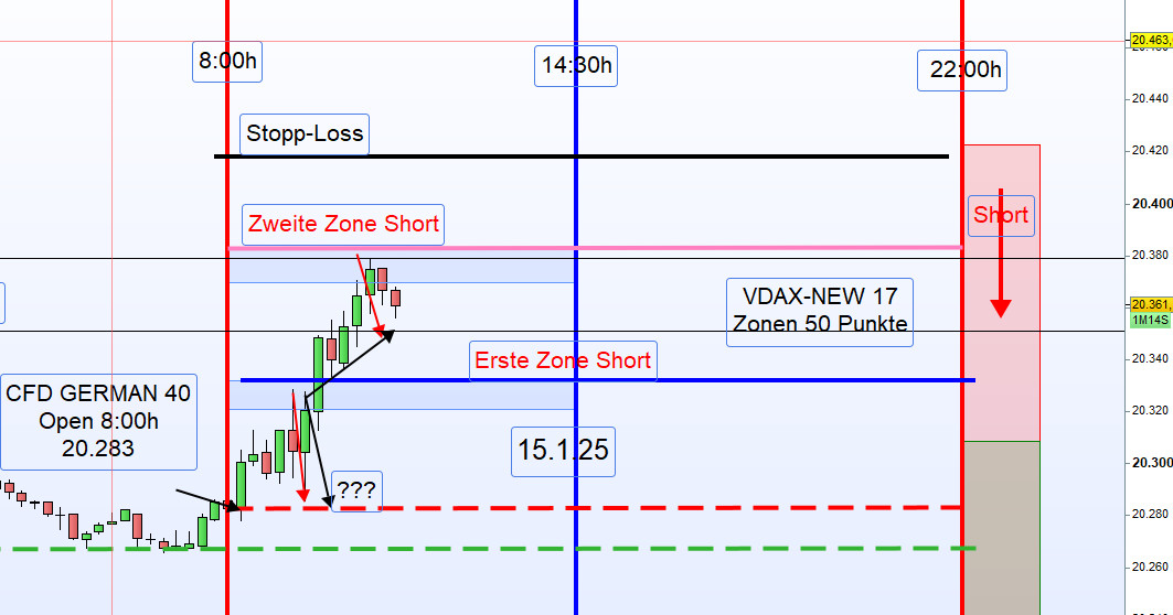 Nach dem starken Trendtag im DAX am Vortag setzte der Kurs den Eindruck einer Trendfortsetzung fort. Der Tag begann mit einem Impuls, doch es zeigte sich ein Retracement unter den Eröffnungskurs von 8 Uhr. Dies bot die erste Gelegenheit, an der ersten Aktionszone eine Long-Position zu eröffnen und dabei einen Gewinn von 40 Punkten zu erzielen.
