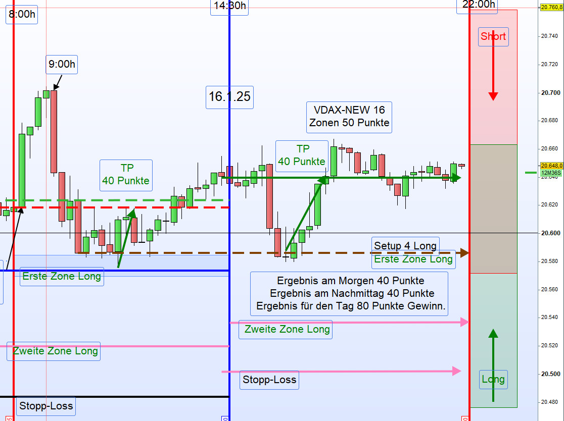Am Nachmittag ergab sich eine weitere Gelegenheit, am Tagestief mithilfe von Setup 4 erneut eine Position zu eröffnen und ebenfalls 40 Punkte Gewinn zu realisieren. Somit wurde ein Gesamtertrag von 80 Punkten erreicht – ein erfolgreicher Handelstag.