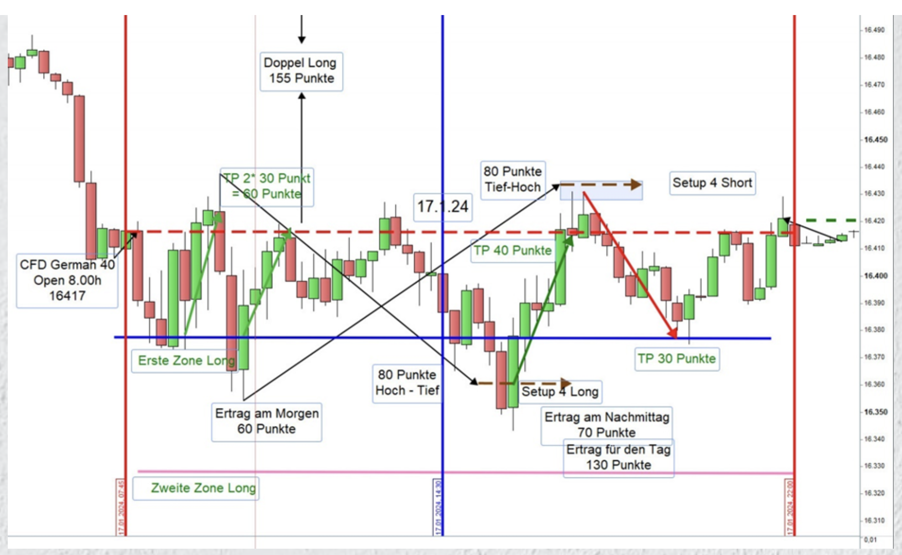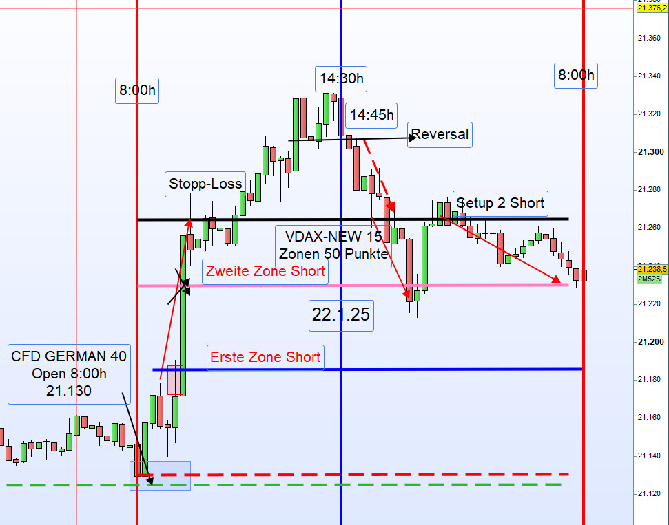 Im Verlauf des Nachmittags konnte das Setup 2 erneut erfolgreich gehandelt werden. Um 14:45 Uhr bot sich zudem die Gelegenheit, ein Reversal-Setup gewinnbringend umzusetzen.