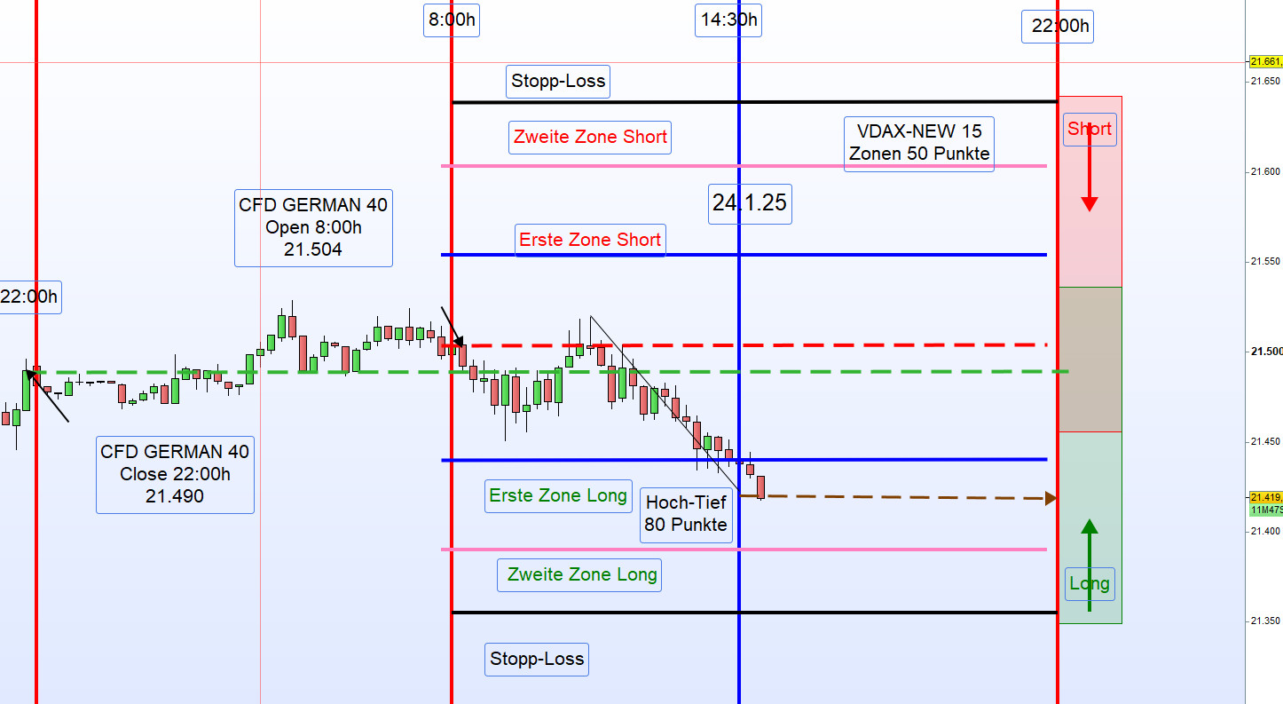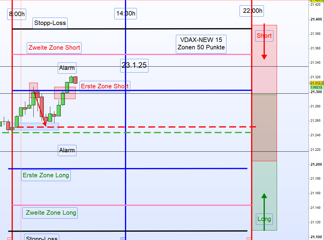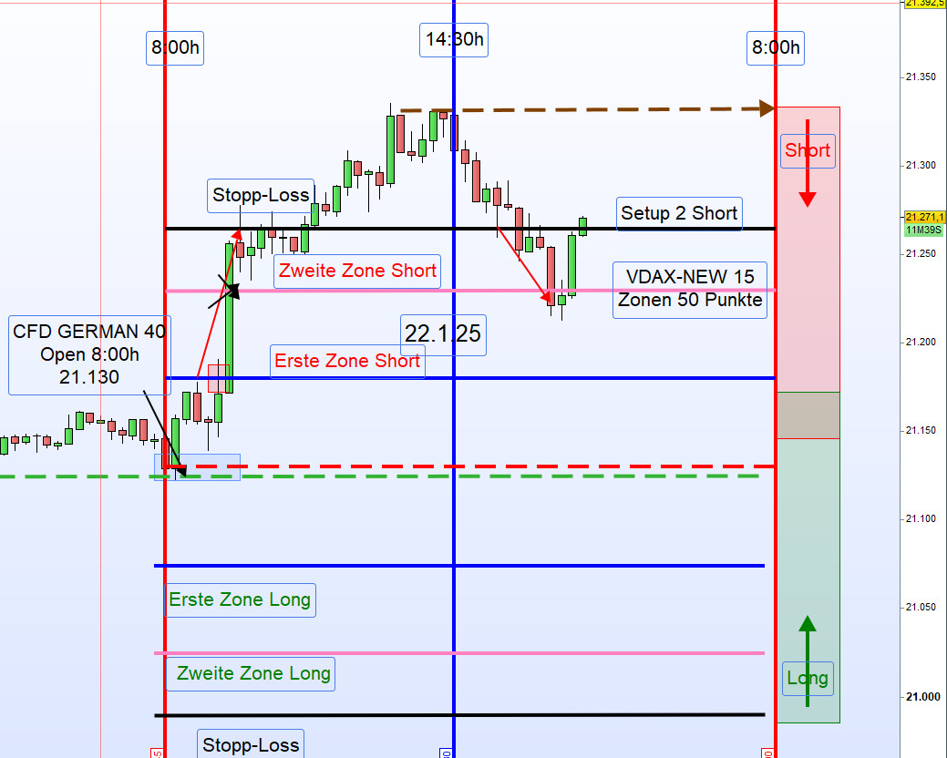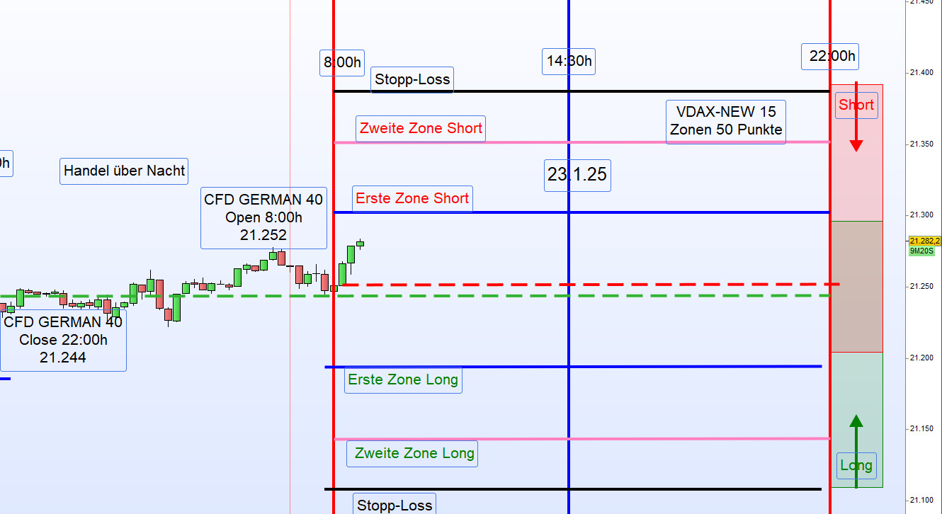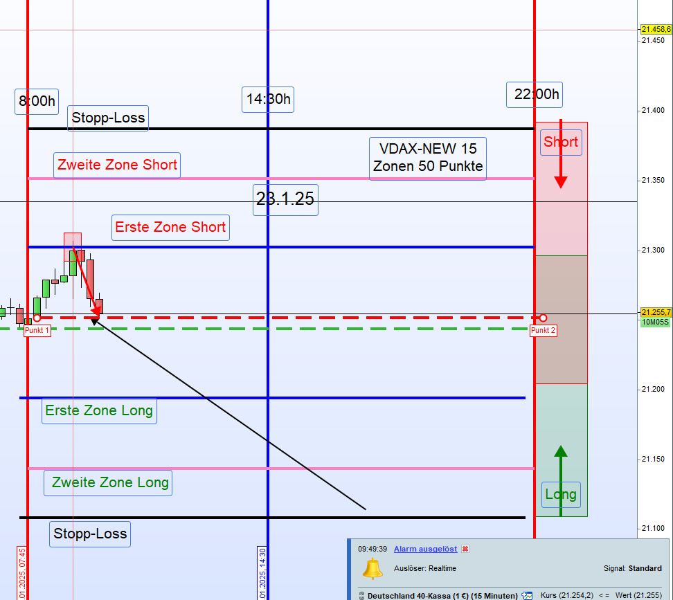Kein Handel unter dem Eröffnungskurs. Ein Short-Einstieg in der ersten Aktionszone erfolgt erst, wenn der Kurs über die erste Aktionszone (Short) gehandelt wird und anschließend korrigiert – bis zum regelbasierten Einstiegspunkt.