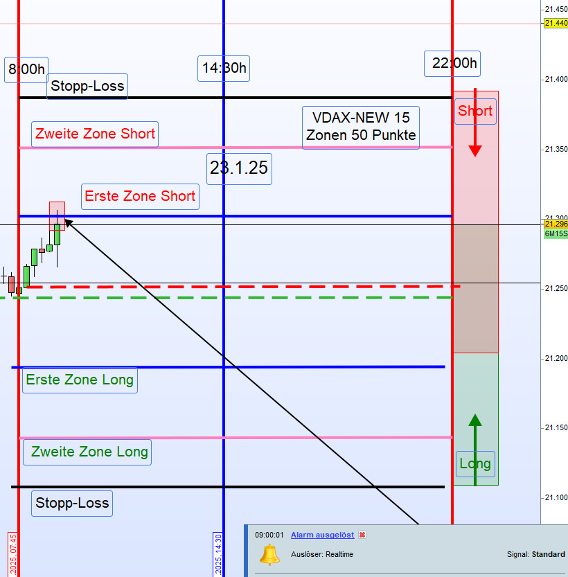 Erfolgreicher Short-TradeAlarm an der ersten Aktionszone Short ausgelöst. Eine Short-Position wurde gemäß Plan eröffnet, basierend auf einem vorbereiteten Stop-Sell-Setup.Der DAX korrigierte anschließend bis zum Eröffnungskurs. Der Alarm zur Gewinnmitnahme wurde ausgelöst, und die Short-Position konnte erfolgreich geschlossen werden. Dieses regelbasierte Vorgehen hat sich erneut bewährt und zeigt ein hohes Gewinnpotenzial. -
