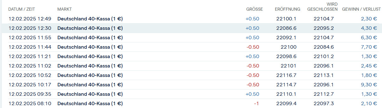 An Tagen ohne Marktbewegung, so wie heute, übe ich zuweilen das Mikro Trading. Immer mit dem geringsten Einsatz zum Beispiel 0,5CFD. (Für betagte Trader eine vorzügliche Übung )