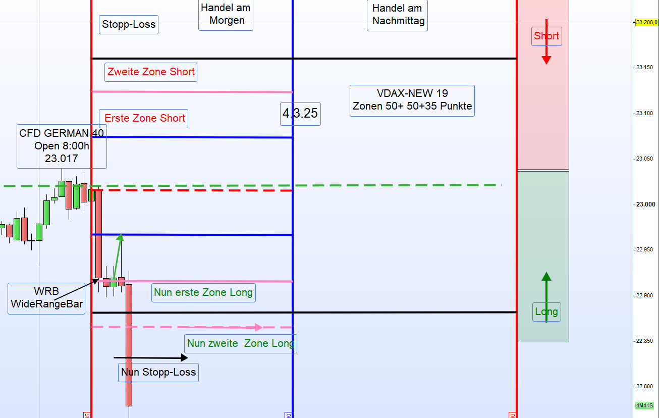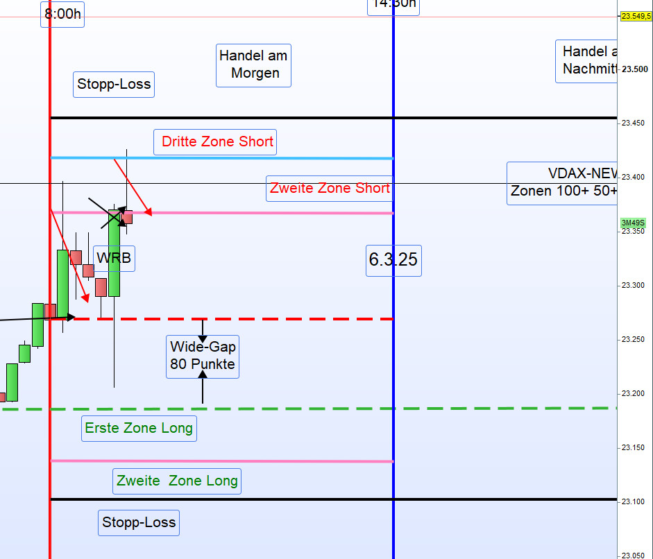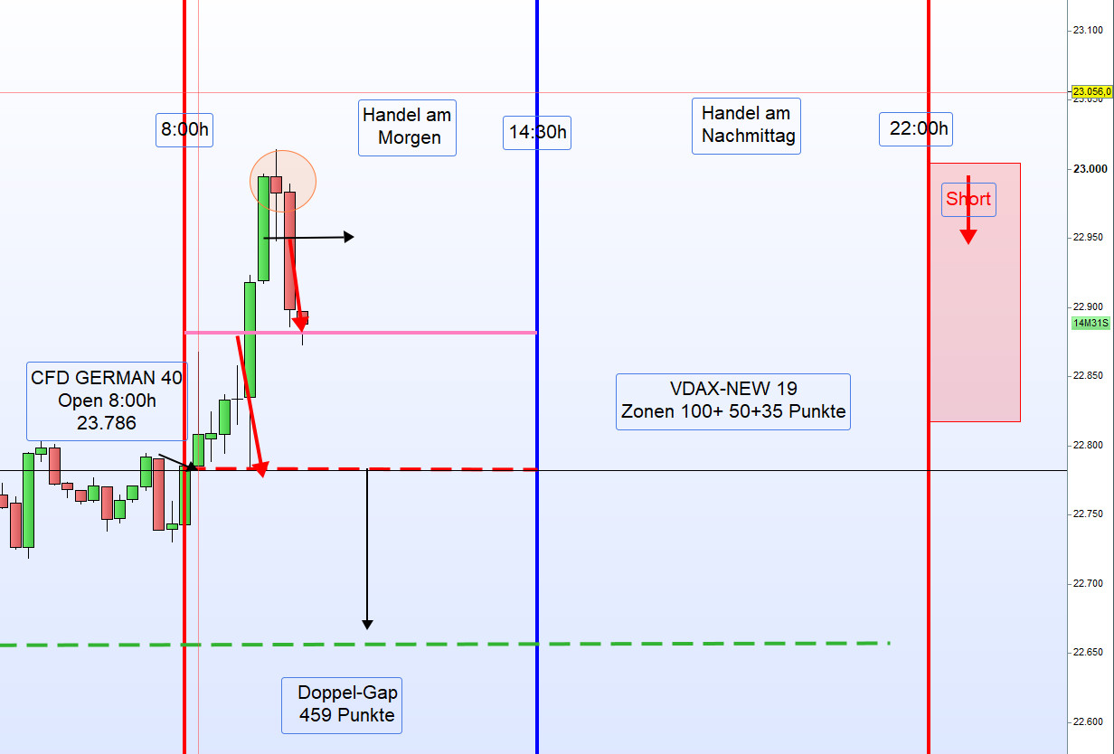 Am Dienstag kehrte sich dieser Trend jedoch um. Der DAX fiel um 3,54 Prozent auf 22.326,81 Punkte, was den größten Tagesverlust seit drei Jahren darstellt. Vom Tief erholte sich der CFD-Kurs wiederum um 500 Punkte. In diesem Umfeld ist der Handel der DAX-Trading-Strategie sehr schwierig, und nur das Regelwerk schützt noch vor Verlusten. Der Handel am Nachmittag war daher auch nicht möglich. Wir müssen uns diesem volatilen Umfeld anpassen, und es werden morgens bis auf Weiteres nur die zweiten Zonen gehandelt. -