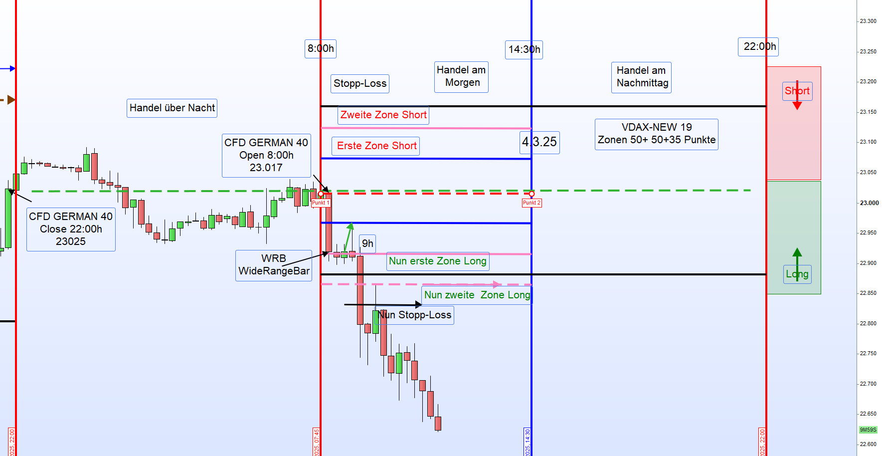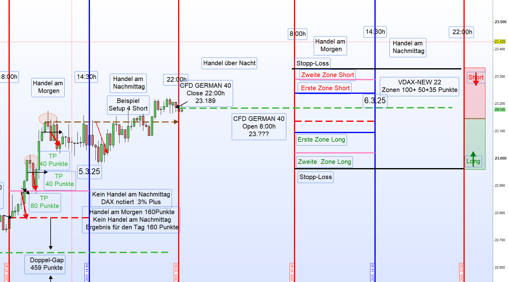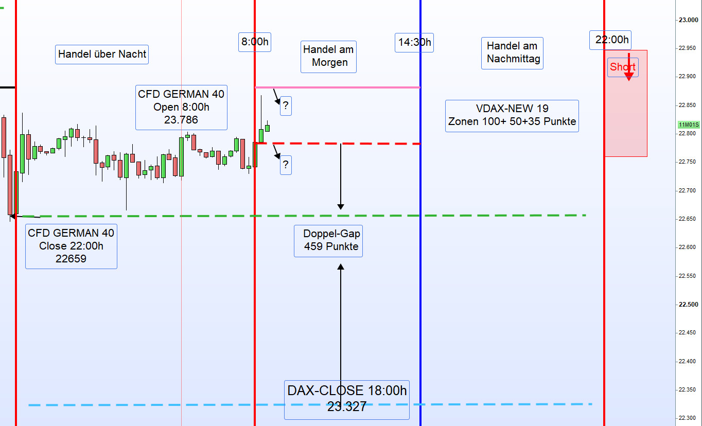 Am Dienstag kehrte sich dieser Trend jedoch um. Der DAX fiel um 3,54 Prozent auf 22.326,81 Punkte, was den größten Tagesverlust seit drei Jahren darstellt. Vom Tief erholte sich der CFD-Kurs wiederum um 500 Punkte. In diesem Umfeld ist der Handel der DAX-Trading-Strategie sehr schwierig, und nur das Regelwerk schützt noch vor Verlusten. Der Handel am Nachmittag war daher auch nicht möglich. Wir müssen uns diesem volatilen Umfeld anpassen, und es werden morgens bis auf Weiteres nur die zweiten Zonen gehandelt. -